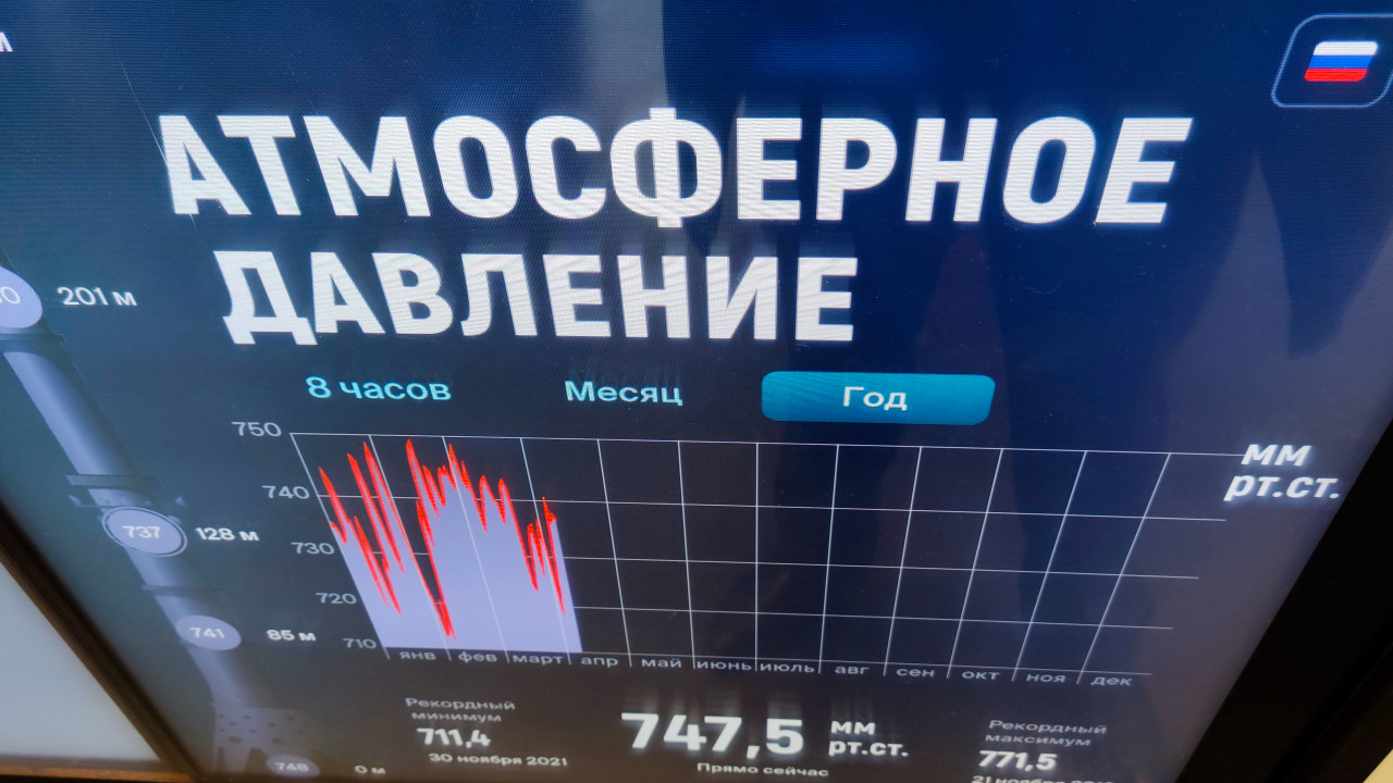 На снимке отображён цифровой информационный экран во внутреннем пространстве Останкинской телебашни, показывающий текущие и исторические значения атмосферного давления в миллиметрах ртутного столба. Подобные стенды используются для пояснения влияния высоты и погодных условий в инженерных сооружениях. Останкинская башня введена в эксплуатацию в 1967 году и служит ключевым центром телерадиовещания, а также туристической площадкой с научно-популярными элементами. Фото может применяться в материалах о метеорологии и музейных медиаинсталляциях.