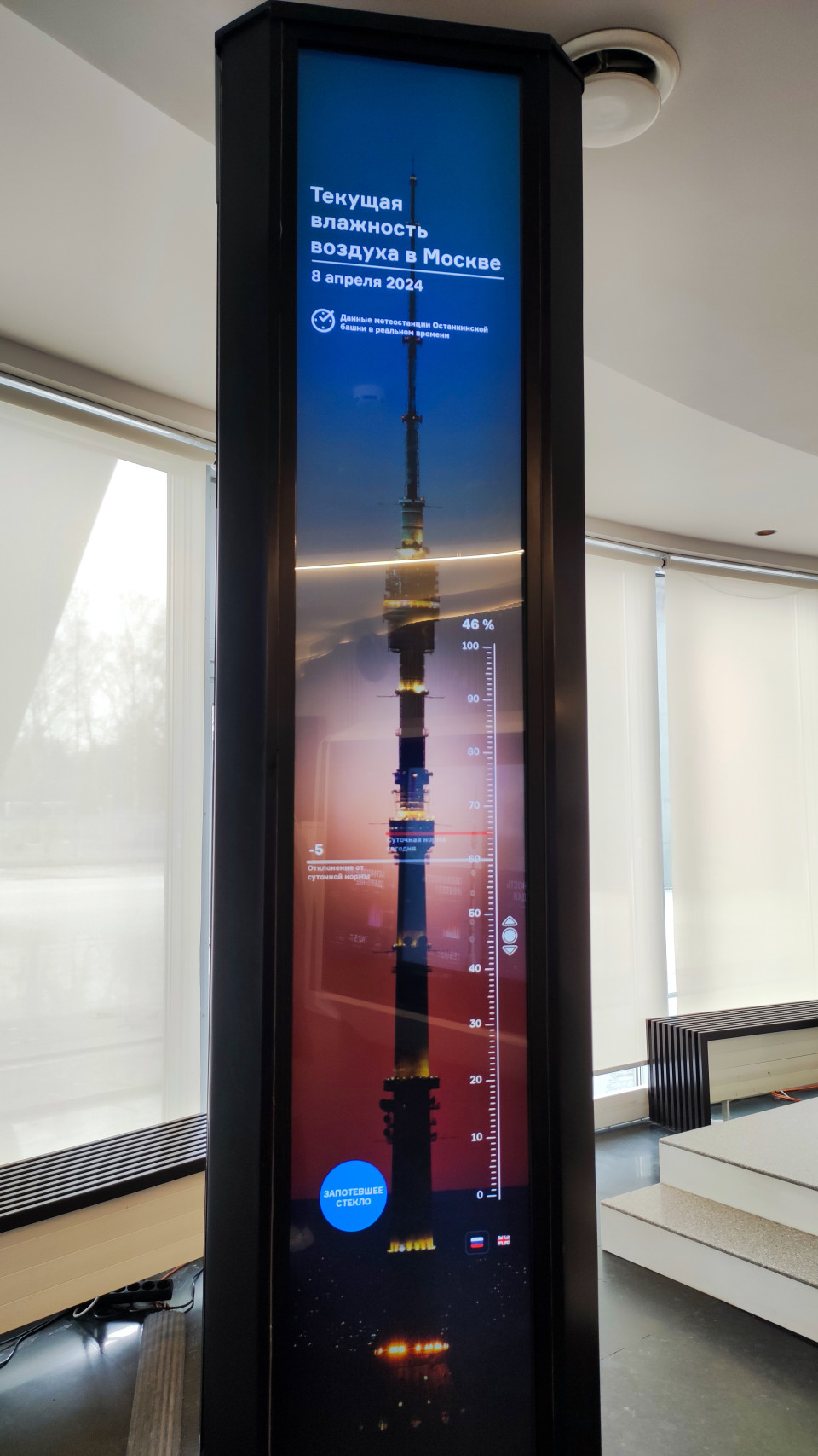 На фото изображён вертикальный мультимедийный стенд внутри смотровой зоны, на котором отображаются данные о влажности воздуха в Москве с указанием даты — 8 апреля 2024 года. Визуальная схема повторяет высотную структуру Останкинской телебашни, построенной в 1967 году и являющейся объектом культурного наследия и символом отечественного телерадиовещания. Отражён современный формат подачи данных для посетителей. Снимок применим для тем о научно-просветительских пространствах, метеоизмерениях и музейных экспозициях в инженерных сооружениях.
