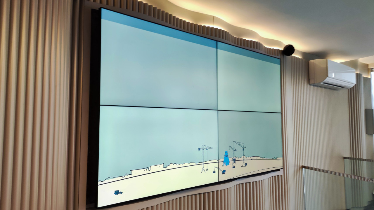 На снимке изображена мультимедийная видеостена, расположенная внутри Останкинской телебашни — архитектурного сооружения 1967 года, являющегося одним из символов российской телерадиовещательной инфраструктуры и объектом культурного значения. Экран демонстрирует схематичное графическое изображение, а вокруг видны панели интерьера и часть инженерных систем, характерных для туристической смотровой зоны. Фотография подходит для тем о современном музейном сервисе, цифровых экспозициях и техническом наследии.