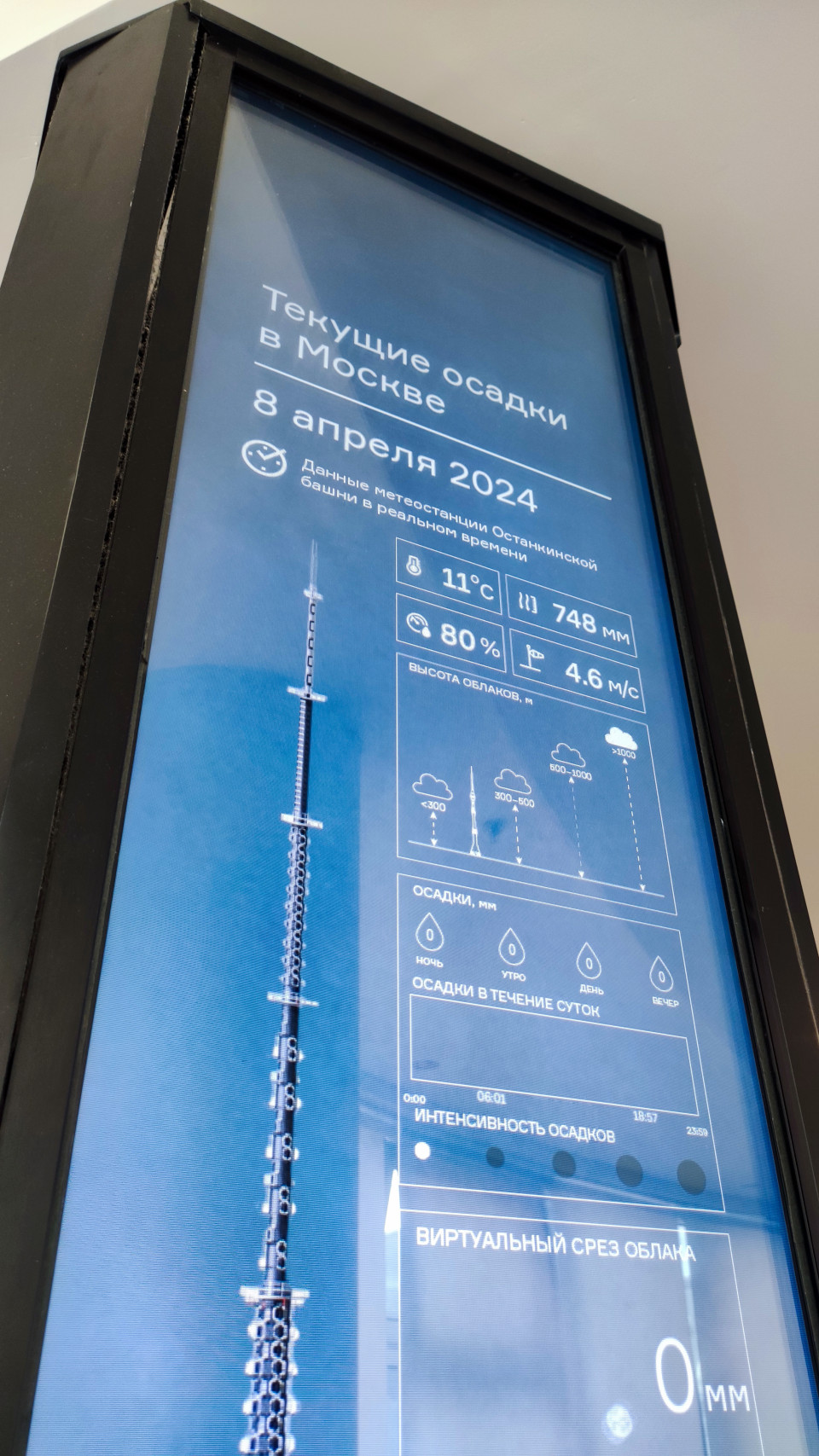 останкинская башня москва интерактивный экран информационная панель цифровая визуализация метеостанция электронный стенд погода Москва Останкинская башня данные в реальном времени атмосферное давление ветер влажность облачность инфраструктура цифровой экран телебашня культурный объект метеоинформация информирование городской сервис статистика мониторинг технология навигация публичный дисплей архитектура урбанистика связь климатПохожие фотографии