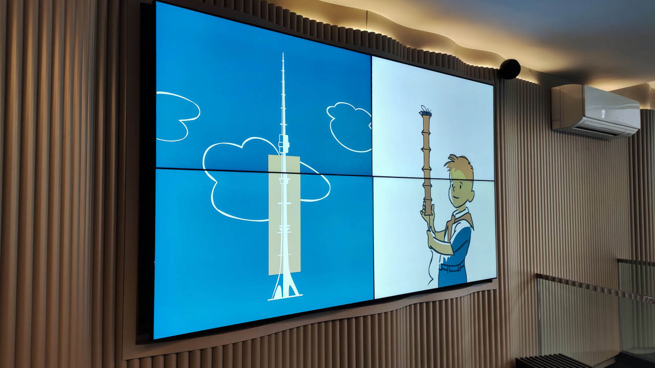 На фото изображён цифровой экран с мультимедийной визуализацией, где слева показана схематичная Останкинская телебашня, а справа — персонаж, демонстрирующий принцип сборки мачтовых секций. Экран установлен в интерьере выставочного пространства с декоративными стеновыми панелями. Останкинская башня, построенная в 1967 году, является знаковым объектом телерадиовещания в России и включена в перечень значимых инженерных сооружений. Снимок может использоваться в материалах по популяризации инженерных профессий и музейных экспозиций.