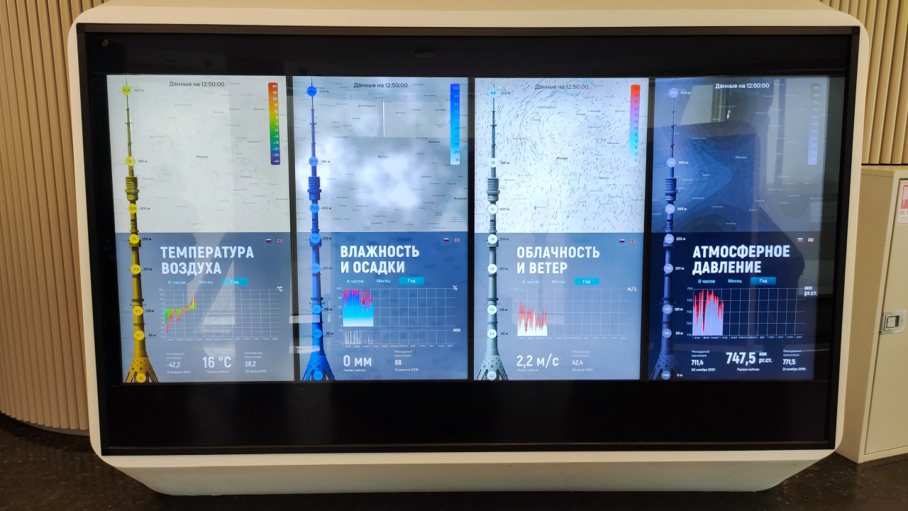 На изображении представлена широкоформатная цифровая панель, состоящая из четырёх экранов, на которых показываются температура воздуха, влажность и осадки, облачность и ветер, а также атмосферное давление. Все показатели связаны с измерениями, проводимыми на разных высотах Останкинской телебашни, построенной в 1967 году и относящейся к знаковым инженерным объектам России. Панель размещена в интерактивной зоне выставочного пространства и служит примером открытых городских данных. Фотография подходит для тем цифровизации, урбанистики и технологий мониторинга окружающей среды.