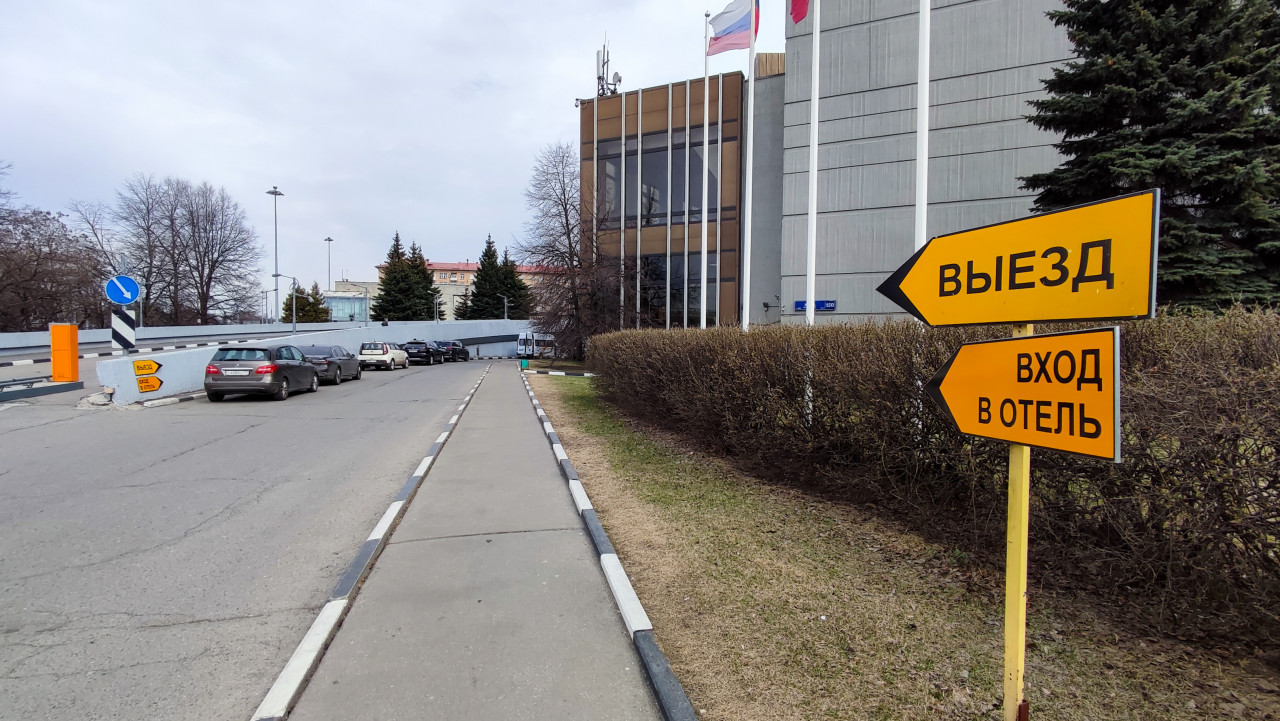 Фотография отображает дорожные указатели выезда и входа в отель на территории гостиницы «Космос» в Москве, возведенной в 1970-х годах к Олимпийским играм. Видны проезжая часть, парковочные места, фасад комплекса и кустарники вдоль пешеходной зоны. Объект относится к значимым гостиницам позднесоветского периода и используется как ориентир в районе ВДНХ. Снимок уместен в тематике городского туризма и инфраструктуры.