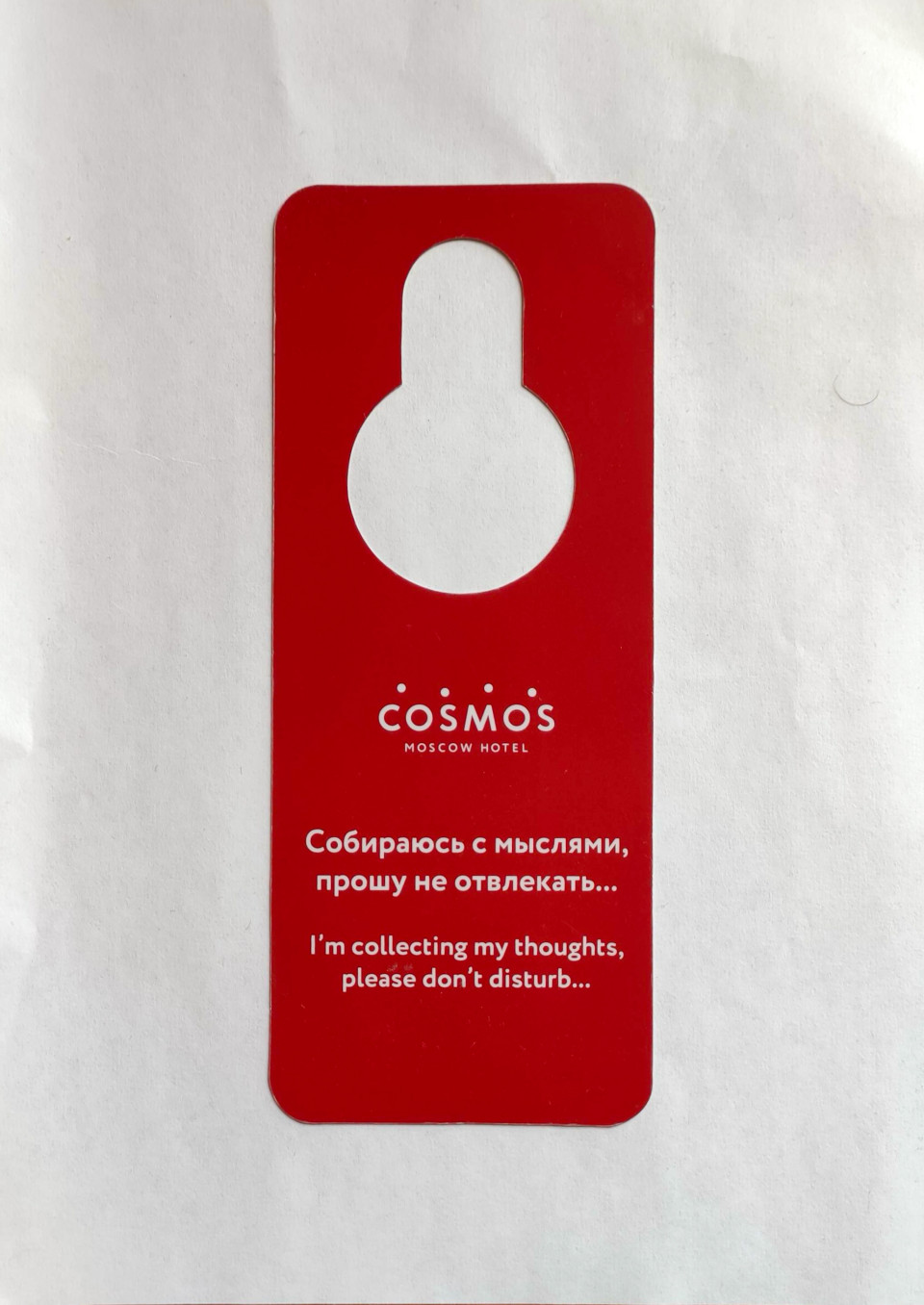 На фото изображена красная дверная бирка формата «не беспокоить» с текстом на русском и английском языках, относящаяся к гостинице Cosmos Moscow Hotel, известной крупным отелем советского периода, построенным рядом с ВДНХ. Cosmos открыт в 1979 году к Московской Олимпиаде и является одной из архитектурных доминант гостиничного фонда той эпохи. Изображение может использоваться в HoReCa-контенте, в темах гостеприимства и оформления гостиничных сервисов.