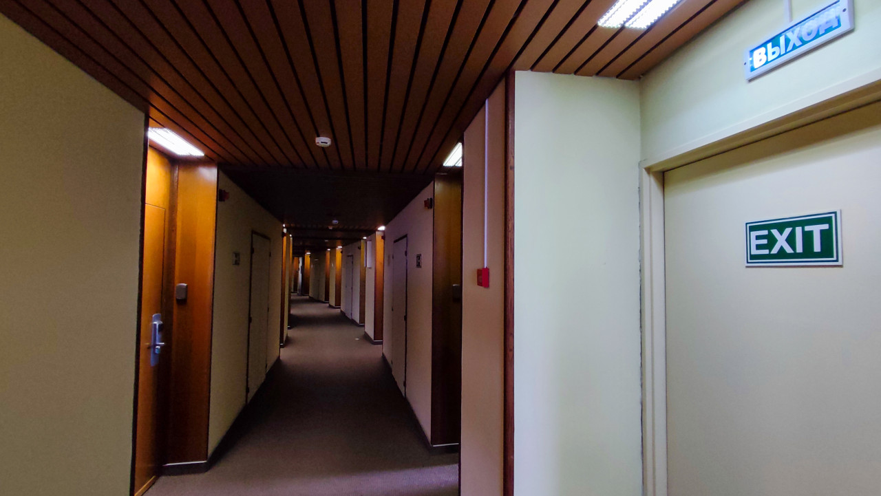 На фото изображён один из коридоров гостиницы «Космос» в Москве, расположенной рядом с ВДНХ и построенной к Олимпийским играм 1980 года. Интерьер оформлен в стиле позднего советского модернизма: ровные линии, широкие коридоры и характерные отделочные материалы. Справа размещён знак EXIT и дублирующая надпись «Выход», что соответствует требованиям эвакуационной навигации в общественных зданиях. Гостиница «Космос» считается знаковым объектом эпохи, построенным при участии французских архитекторов и использующимся до настоящего времени. Снимок подходит для материалов об отельной инфраструктуре, архитектуре позднего СССР и туристических объектах Москвы.