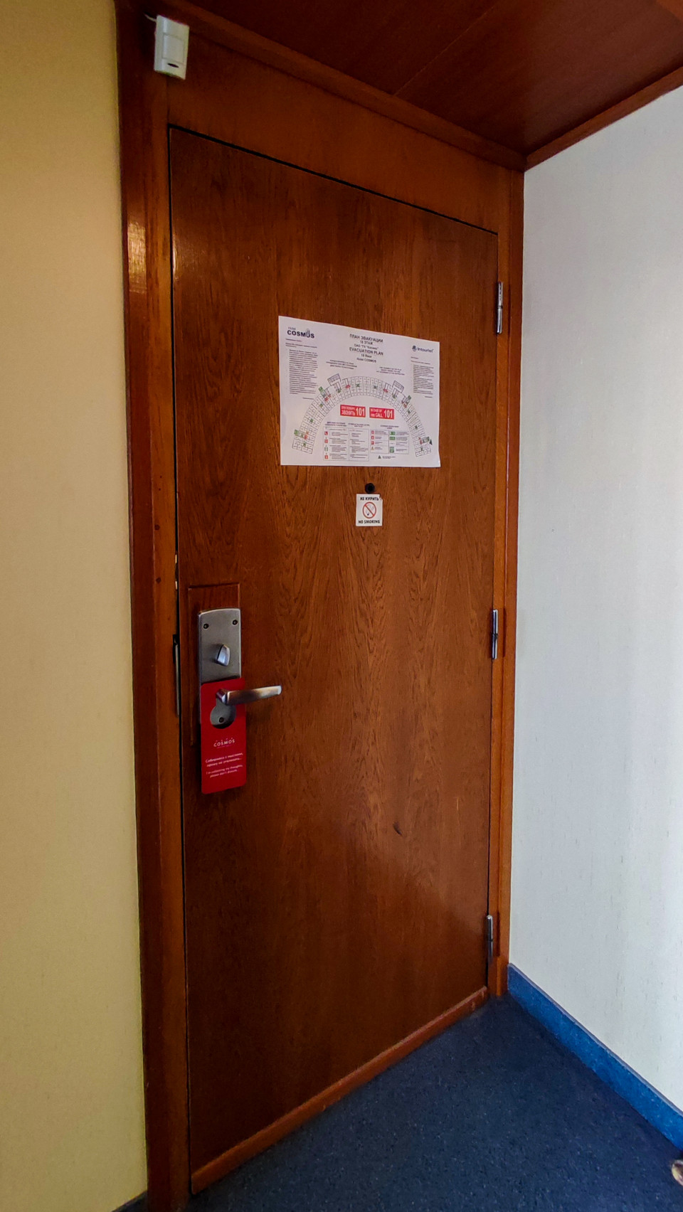 На фото изображена входная дверь гостиничного номера, на которой размещён план эвакуации и предупреждающая пиктограмма о запрете курения. Снизу на ручке висит сервисная бирка отеля Cosmos Moscow Hotel. Cosmos — крупный гостиничный комплекс, построенный к Олимпиаде 1980 года рядом с ВДНХ и долгое время служивший одной из крупнейших гостиниц СССР. Изображение отражает внутреннюю инфраструктуру гостиницы и может использоваться в материалах о работе средств размещения, сервисных стандартах и организации безопасности гостей.