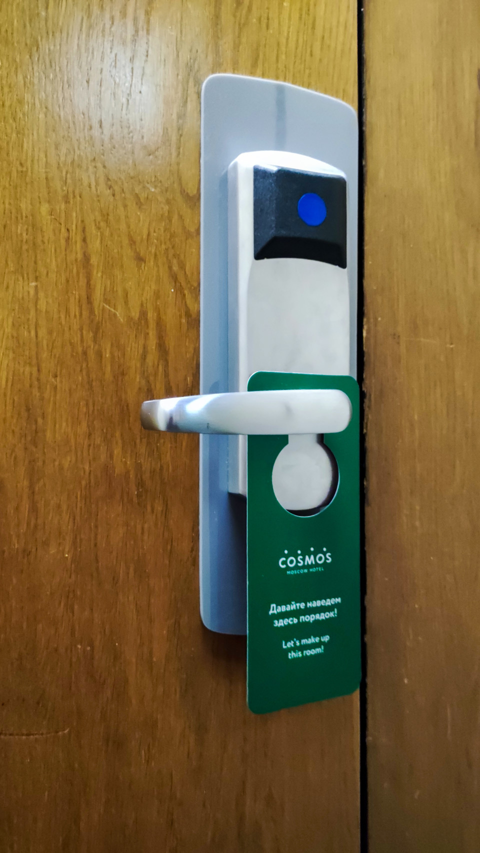 На снимке изображена дверная ручка гостиничного номера с табличкой «Давайте наведем здесь порядок» на русском и английском языках. Судя по фирменной символике, помещение относится к гостинице «Космос», построенной к Олимпийским играм 1980 года и являющейся значимым примером гостиничной архитектуры позднего советского модернизма. В кадре видны элементы деревянной отделки двери и электронного замка. Фотография подходит для материалов о сфере услуг, гостиничной инфраструктуре и внутренней организации сервисных процессов.
