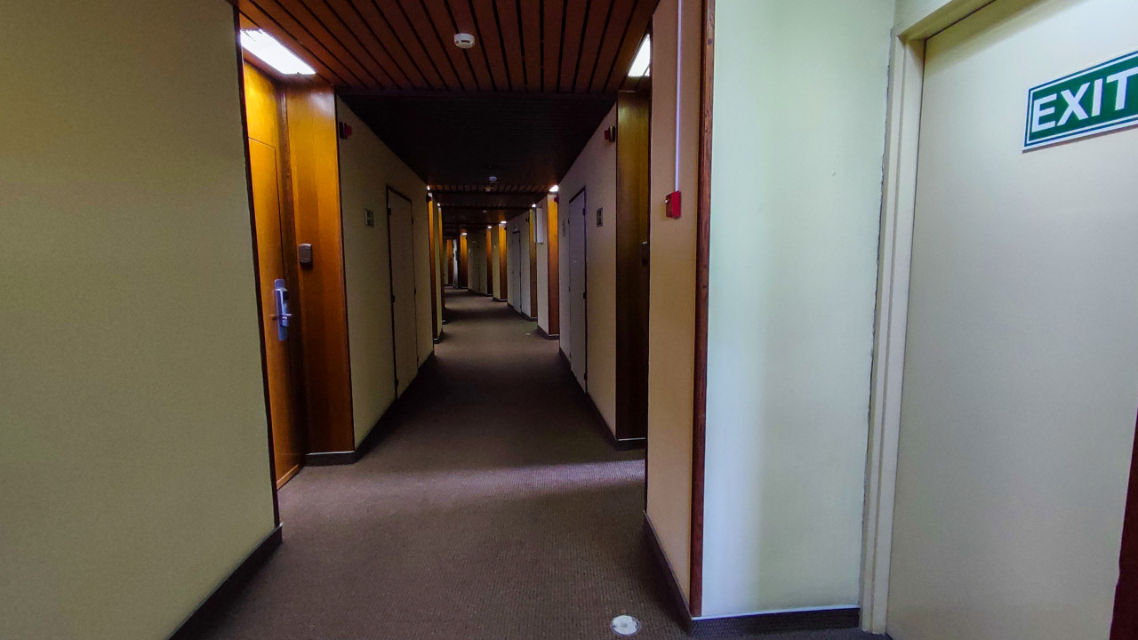 Снимок показывает длинный гостиничный коридор с дверями номеров, потолочным освещением и светлыми стенами, идентифицируемый как часть отеля Cosmos Moscow Hotel. Композиция демонстрирует типичный план коридоров крупных гостиниц советского периода, где преобладает вытянутая галерея с повторяющимися дверьми. Фото можно использовать в материалах о гостиничном сервисе, внутренней логистике отелей, планировке номерных корпусов и архитектуре объектов размещения.