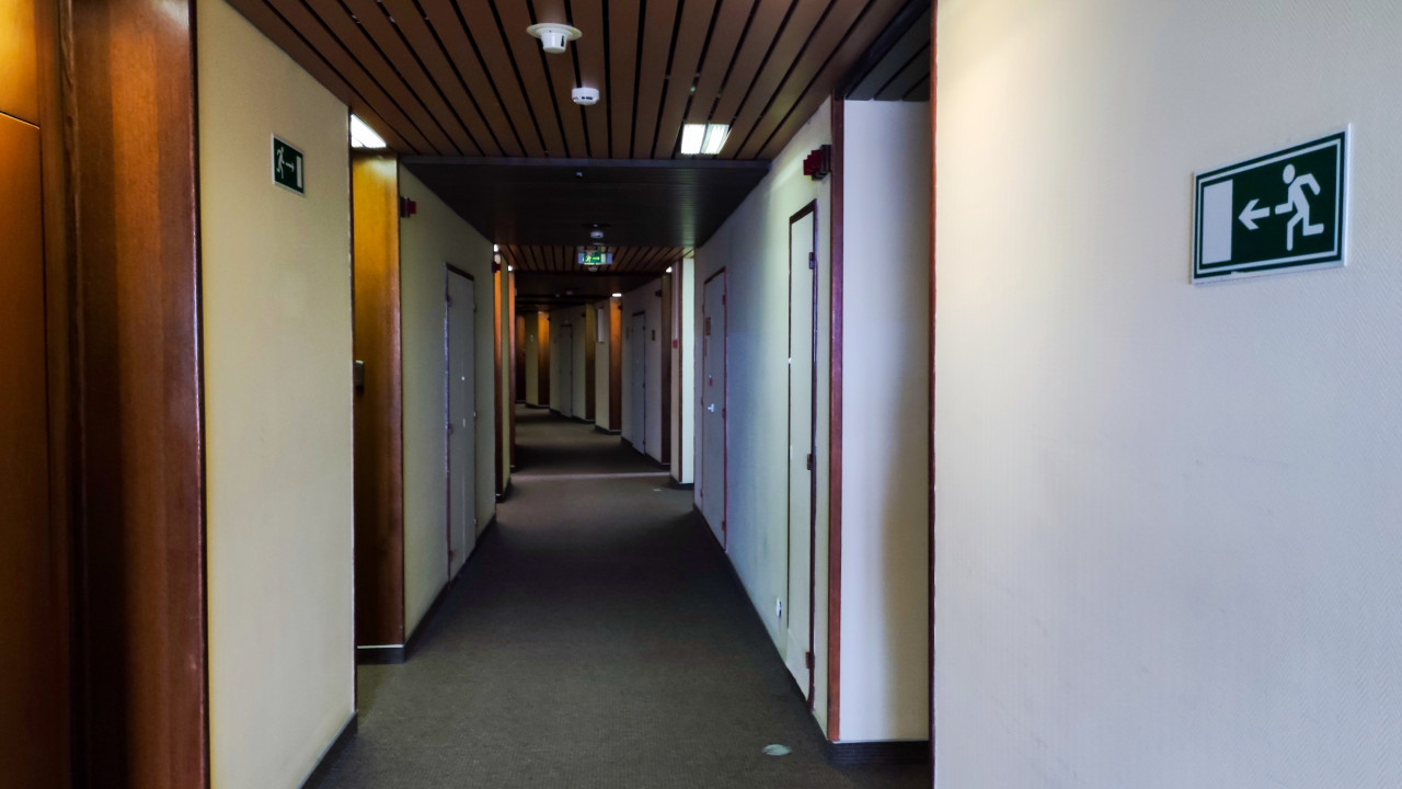 На изображении запечатлён типовой коридор гостиницы «Космос» — крупного гостиничного комплекса, построенного в 1979 году к Олимпиаде-80 и являющегося примером советского модернизма. Вдоль коридора по обе стороны расположены двери номеров, на стенах установлены таблички направления аварийного выхода, потолок оформлен панелями линейного освещения. Пространство отражает планировку советских гостиниц крупного масштаба. Фотография подходит для публикаций о гостиничной инфраструктуре и истории объектов размещения.