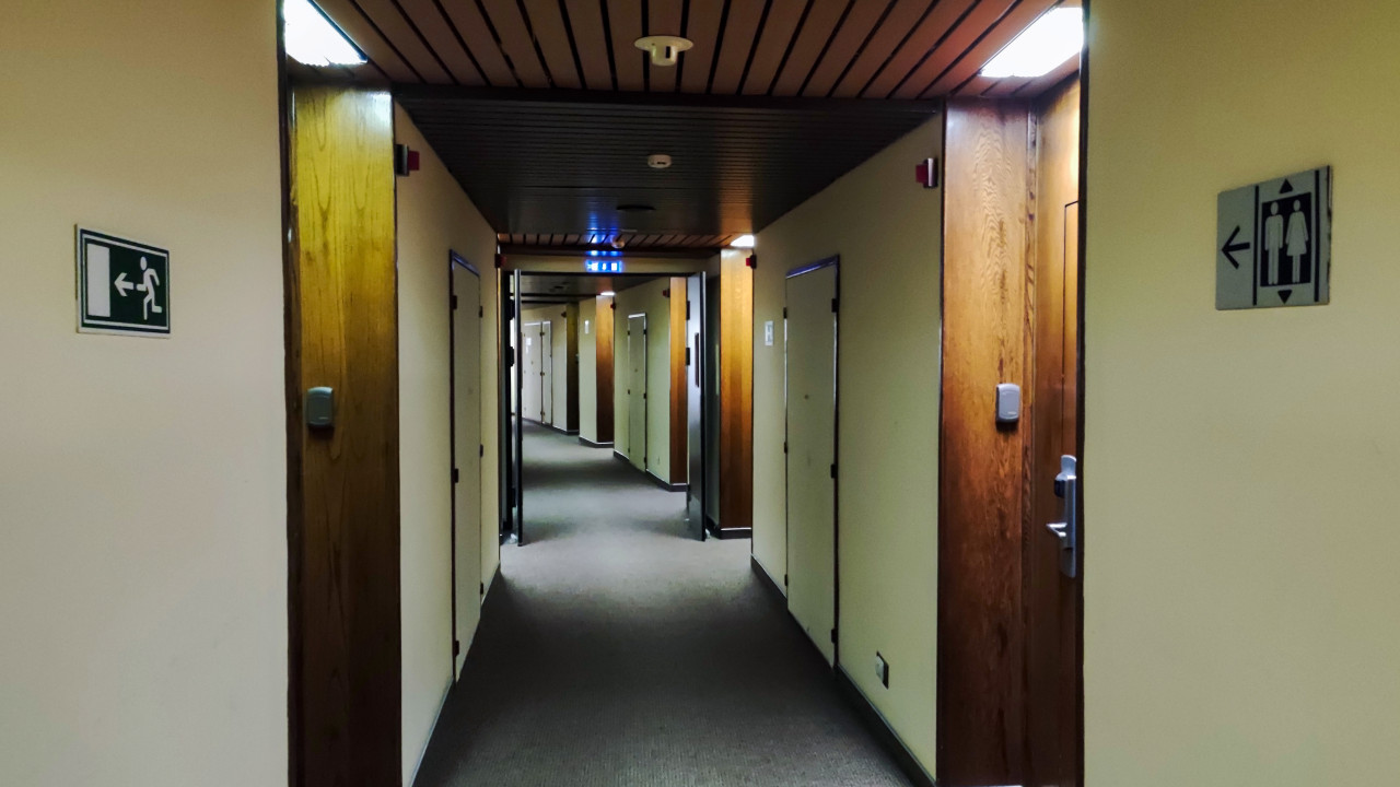 На фото показан внутренний коридор гостиницы «Космос» — крупного гостиничного комплекса, построенного к Олимпийским играм 1980 года совместно советскими и французскими архитекторами. Здание является значимым объектом позднего модернизма и известно своей масштабной инфраструктурой. В кадре видны двери номеров, указатели эвакуации и санитарных помещений, а также характерные интерьерные панели и потолочная отделка. Снимок подходит для иллюстраций, связанных с гостиничной архитектурой и инфраструктурой общественных интерьеров.