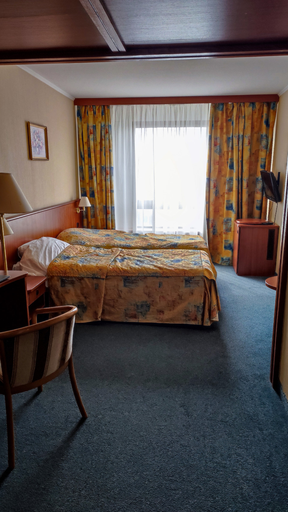 На изображении представлен интерьер стандартного гостиничного номера в комплексе «Космос», построенном к Олимпиаде 1980 года и относящемся к знаковым объектам позднего советского модернизма. В кадре видны две раздельные кровати, прикроватные тумбы, письменный стол, стул и телевизор у окна, оформленного плотными шторами. Помещение выдержано в традиционной планировке гостиниц конца XX века. Снимок может быть использован в материалах о гостиничном сервисе, советском архитектурном наследии и типовых интерьерах туристической инфраструктуры.