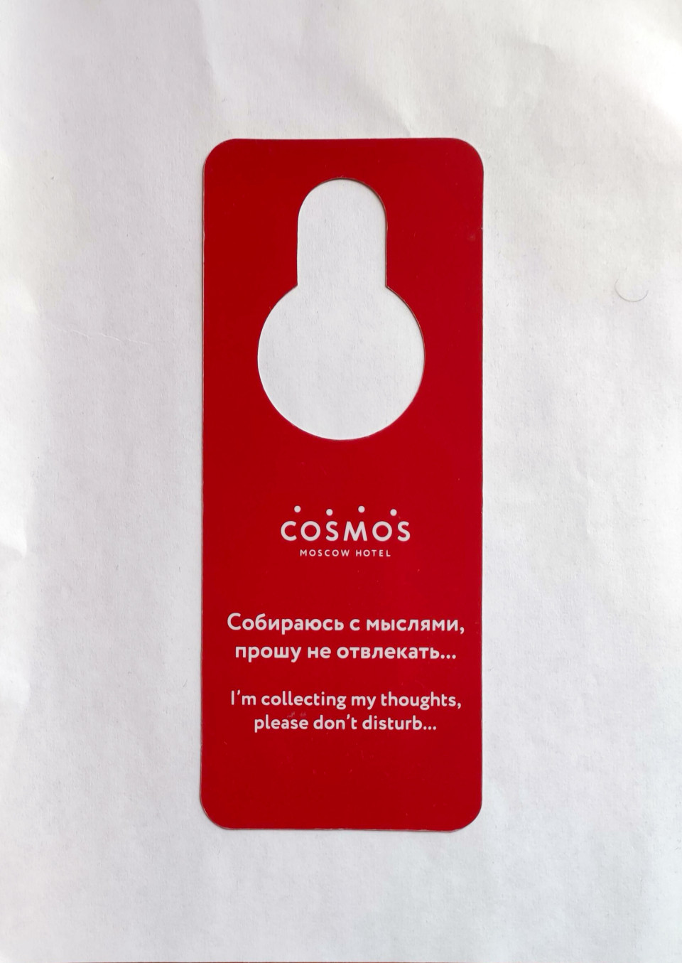 На фото изображена красная двусторонняя бирка «Собираюсь с мыслями, прошу не отвлекать…» от гостиницы «Космос» в Москве, построенной в 1979 году к Олимпийским играм. Бирка лежит на белом фоне и предназначена для размещения на дверной ручке, чтобы предупредить персонал об отказе от уборки или посещения номера. Отель «Космос» является крупным гостиничным комплексом, расположенным у ВДНХ и относящимся к объектам позднесоветского модернизма. Фотография может использоваться в материалах о гостиничном сервисе и стандартах обслуживания.