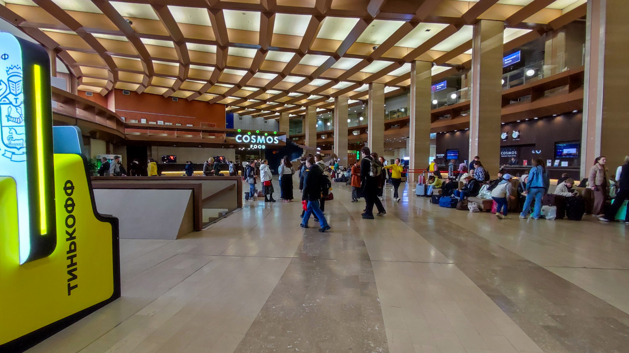 На фотографии показан просторный вестибюль гостиницы «Космос» в Москве, построенной в 1979 году к Олимпиаде-80 и ставшей одним из крупнейших гостиничных комплексов позднесоветского модернизма. В кадре видны посетители с багажом, стойки обслуживания, фуд-зона «Cosmos Food» и характерное кессонное потолочное перекрытие, являющееся элементом оригинального архитектурного проекта. На переднем плане заметен брендированный терминал, слева — зона прохода к нижнему уровню. Снимок подходит для использования в материалах о гостиничном бизнесе, туризме и архитектуре общественных пространств.
