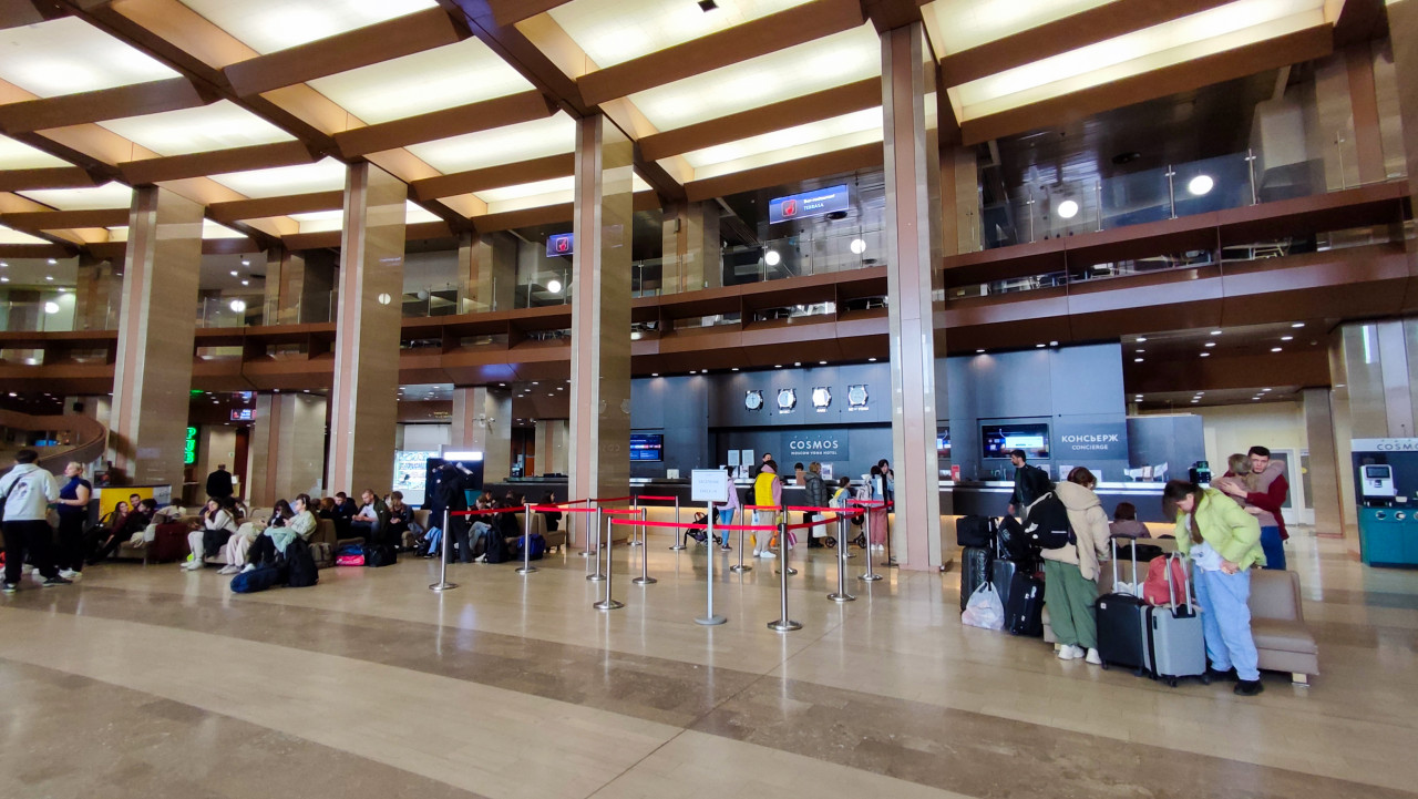 На фотографии запечатлена стойка регистрации гостиницы «Космос» в Москве, сооружённой к Олимпийским играм 1980 года и являющейся знаковым примером архитектуры позднесоветского модернизма. В кадре видны сотрудники и посетители у зоны check-in, информационные экраны, перегородки для очереди и сидячая зона с багажом гостей. Верхний уровень холла выполнен в открытой планировке с балюстрадами. Фотография подходит для использования в материалах о гостиничных услугах, логистике приема туристов и управлении публичными пространствами.