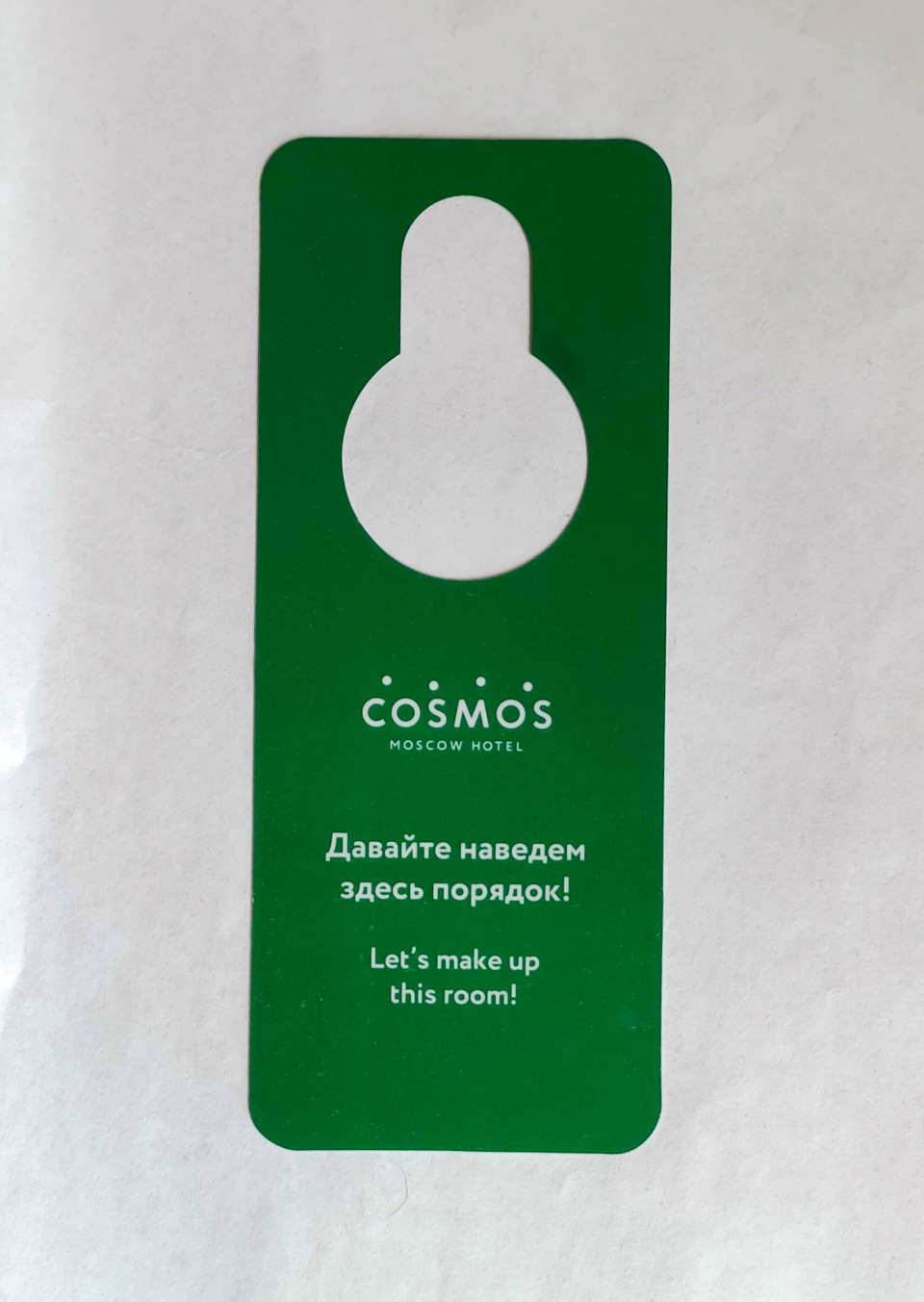 На изображении крупным планом показана зелёная бирка «Давайте наведем здесь порядок!» от гостиницы «Космос», размещённая на белом фоне. Она служит стандартным элементом коммуникации между гостем и обслуживающим персоналом. Отель был возведён в 1979 году в Москве в контексте подготовки к Олимпиаде-80 и стал одним из крупнейших гостиничных объектов модернистской эпохи. Кадр может использоваться для иллюстраций брендирования гостиниц и сервисных решений.
