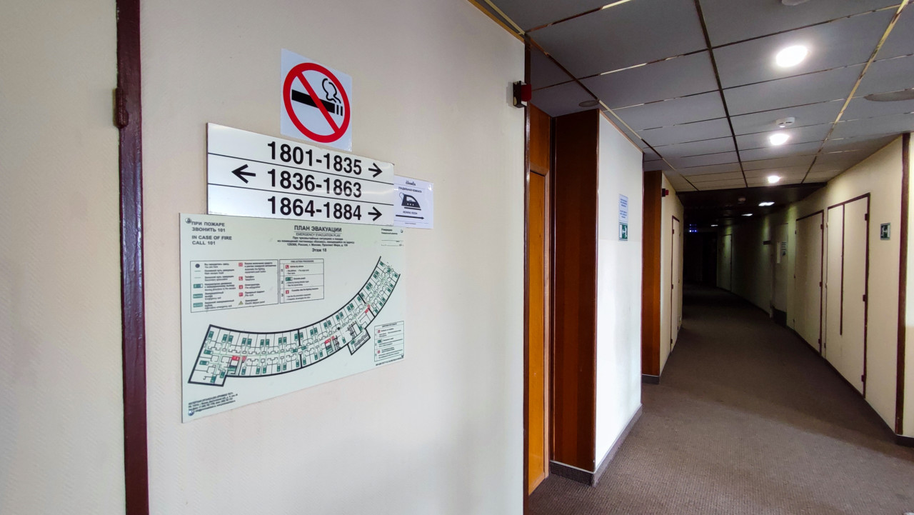 Снимок показывает участок гостиничного коридора с размещёнными на стене указателями номеров, знаком «Не курить» и планом эвакуации. Видны элементы отделки: деревянные панели, подвесной потолок и ковровое напольное покрытие, характерные для крупных отелей 1970-х годов, таких как «Космос» в Москве, построенный к Олимпиаде-80. Фотография подходит для иллюстраций тем безопасности, внутренней логистики и ориентации гостей в гостиничных комплексах.