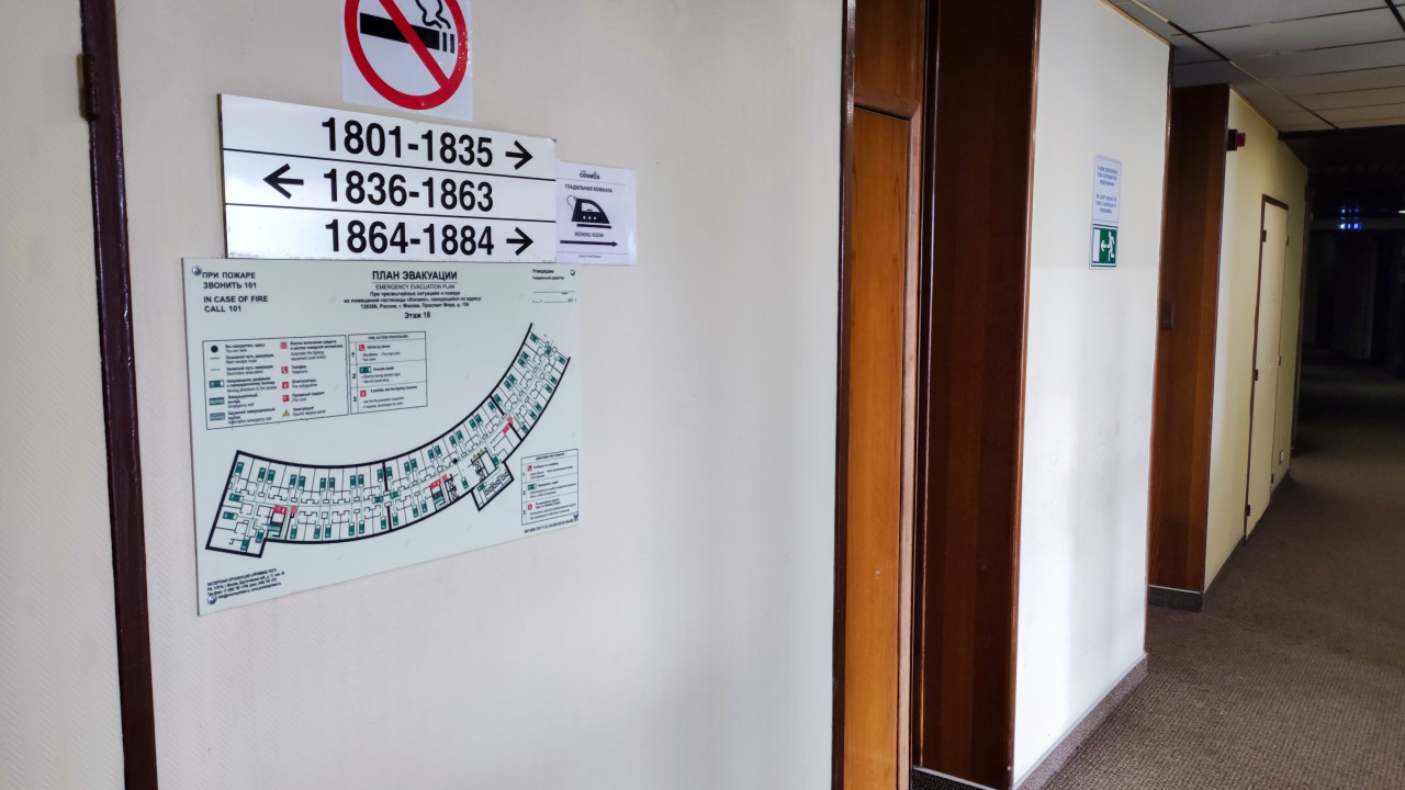 На фото изображен участок гостиничного коридора с навигационными табличками номеров, знаком запрета курения и крупным планом плана эвакуации. Обстановка типична для крупных гостиничных комплексов советской эпохи, с деревянными декоративными панелями и ковровым покрытием. Исходя из стиля навигации, интерьер принадлежит гостинице «Космос», построенной в 1979 году в Москве для Олимпиады-80. Кадр подходит для материалов о гостиничных регламентах и стандартах безопасности.