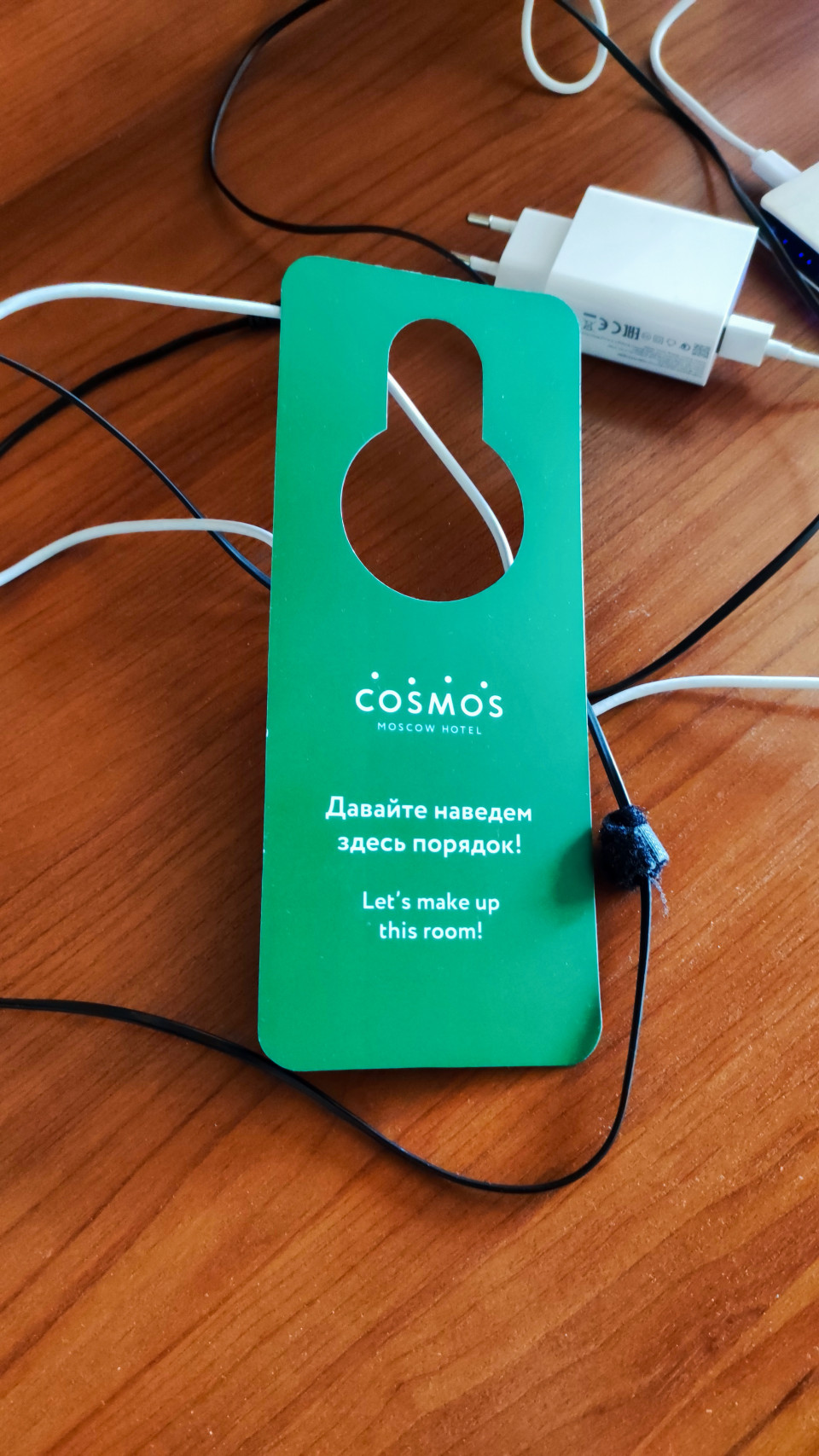 На фотографии показана зелёная бирка «Давайте наведем здесь порядок» от отеля «Космос», лежащая на деревянной столешнице среди проводов и зарядных устройств. Такой элемент используется для уведомления персонала об уборке номера. Гостиница «Космос» была построена в 1979 году к Олимпиаде-80 и является крупным отельным комплексом модернистской архитектуры. Изображение подходит для иллюстрации гостиничного обслуживания, сервисной коммуникации и предметов номерного фонда.