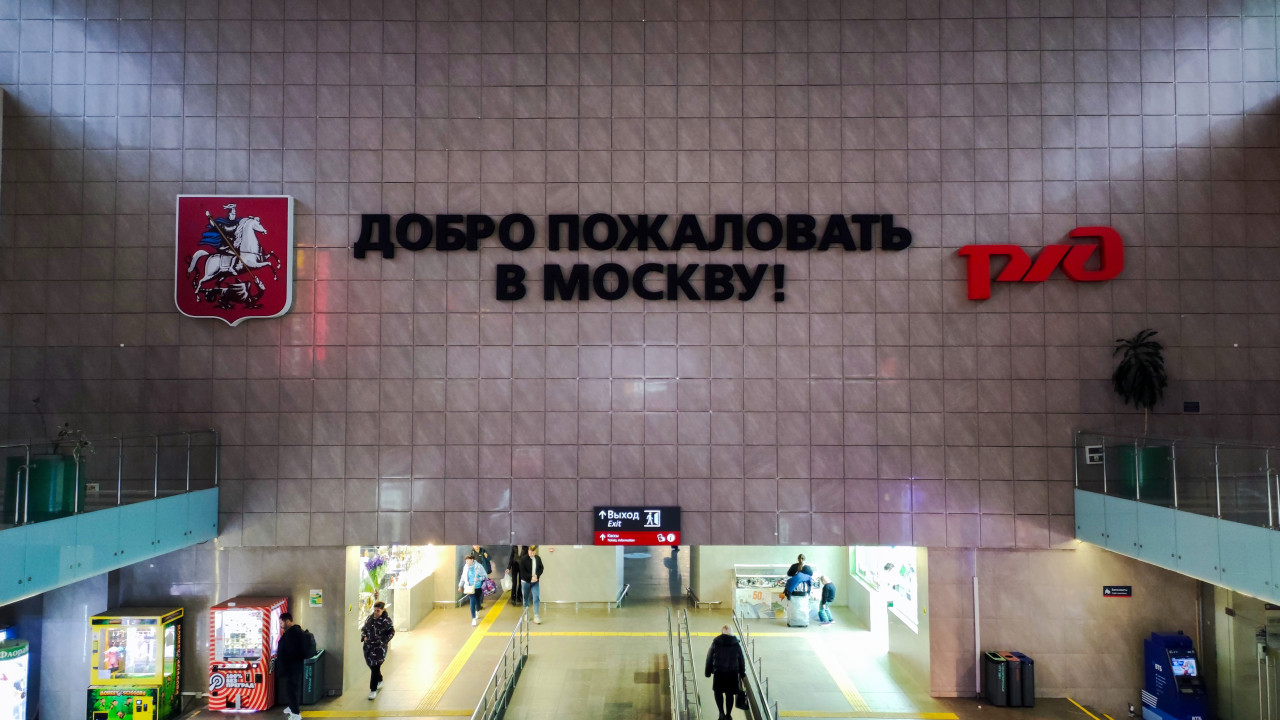 На снимке запечатлена стена Ленинградского вокзала в Москве с надписью «Добро пожаловать в Москву!», гербом города с изображением Георгия Победоносца и логотипом РЖД. Внизу видны выходы и пандусы, ведущие к пассажирским переходам и залам ожидания. Ленинградский вокзал — старейший в столице, открыт в 1851 году и соединяет Москву с Санкт-Петербургом. Его архитектурный облик был создан Константином Тоном, автором ряда знаковых зданий XIX века. Фото подходит для использования в туристических и транспортных публикациях.