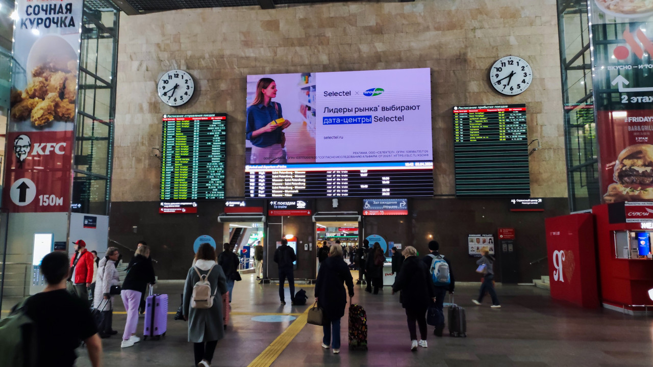 Фотография показывает центральный зал Ленинградского вокзала в Москве — старейшего вокзала города, построенного в 1851 году архитектором Константином Тоном. На стене размещены большие электронные табло отправления и прибытия поездов, а также два классических циферблатных часов. Внизу видно множество пассажиров с багажом, направляющихся к поездам. Вокзал исторически соединяет Москву и Санкт-Петербург и является символом железнодорожного сообщения между двумя столицами России. Изображение подходит для публикаций о транспорте, архитектуре и логистике.