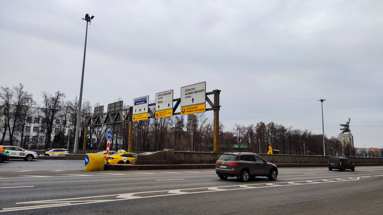 В кадре запечатлена городская магистраль с дорожными указателями и памятником «Рабочий и колхозница» на дальнем плане справа. Этот монумент — значимый объект культурного наследия СССР, созданный скульптором Верой Мухиной и открытый в 1937 году для Всемирной выставки в Париже, впоследствии перенесённый и ставший символом советской монументальной пластики. На переднем плане видны автомобили, дорожное ограждение и уличное освещение. Изображение применимо для материалов о Москве, градостроительстве и культурных достопримечательностях.