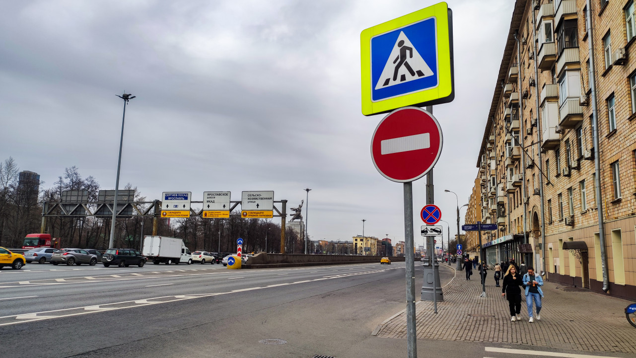 Снимок показывает пешеходную часть вдоль крупной магистрали, визуально совпадающей с направлением проспекта Мира в Москве, что подтверждается расположенными впереди указателями и конфигурацией дорожного полотна. В правой части расположены жилые дома советского периода, слева — интенсивный автомобильный поток. На переднем плане установлены знаки «пешеходный переход» и «въезд запрещён», а также информационные указатели маршрутов. Кадр можно использовать в материалах о транспортной навигации, регулировании движения и городской среде.