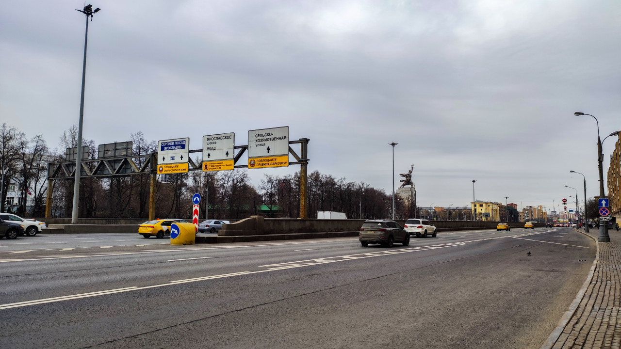 На снимке запечатлён участок крупной магистрали в Москве в районе проспекта Мира, ведущей в сторону Ярославского шоссе и городов Сергиев Посад и Ярославль. На горизонте виден монумент «Рабочий и колхозница» — знаковая скульптура, созданная в 1937 году скульптором Верой Мухиной для советского павильона на Международной выставке в Париже и позднее установленная у ВДНХ. В кадре присутствуют дорожные знаки, опоры освещения, движение автомобилей и деревья вдоль проезжей части. Такой снимок подходит для материалов о транспортной инфраструктуре, урбанистике и культурных ориентирах города.