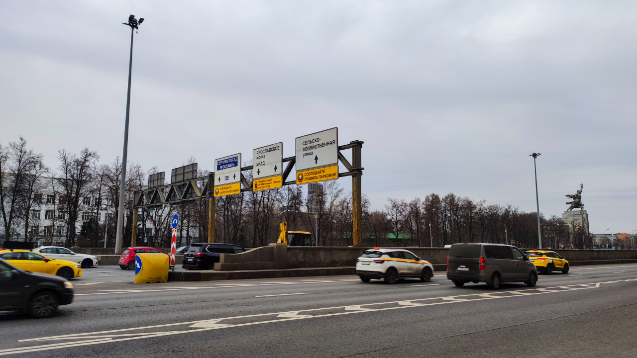 На снимке показана многополосная магистраль в районе проспекта Мира в Москве с движущимся автотранспортом, ведущая к развязке на Ярославское шоссе и выезд в сторону Сергиева Посада и Ярославля. На заднем плане заметен монумент «Рабочий и колхозница», установленный рядом с ВДНХ и являющийся знаковым примером монументальной скульптуры 1930-х годов. Видны дорожные указатели, опоры освещения, автомобили и деревья, очерчивающие границы трассы. Снимок можно использовать в материалах о транспортных маршрутах, городской логистике и визуальных ориентирах.