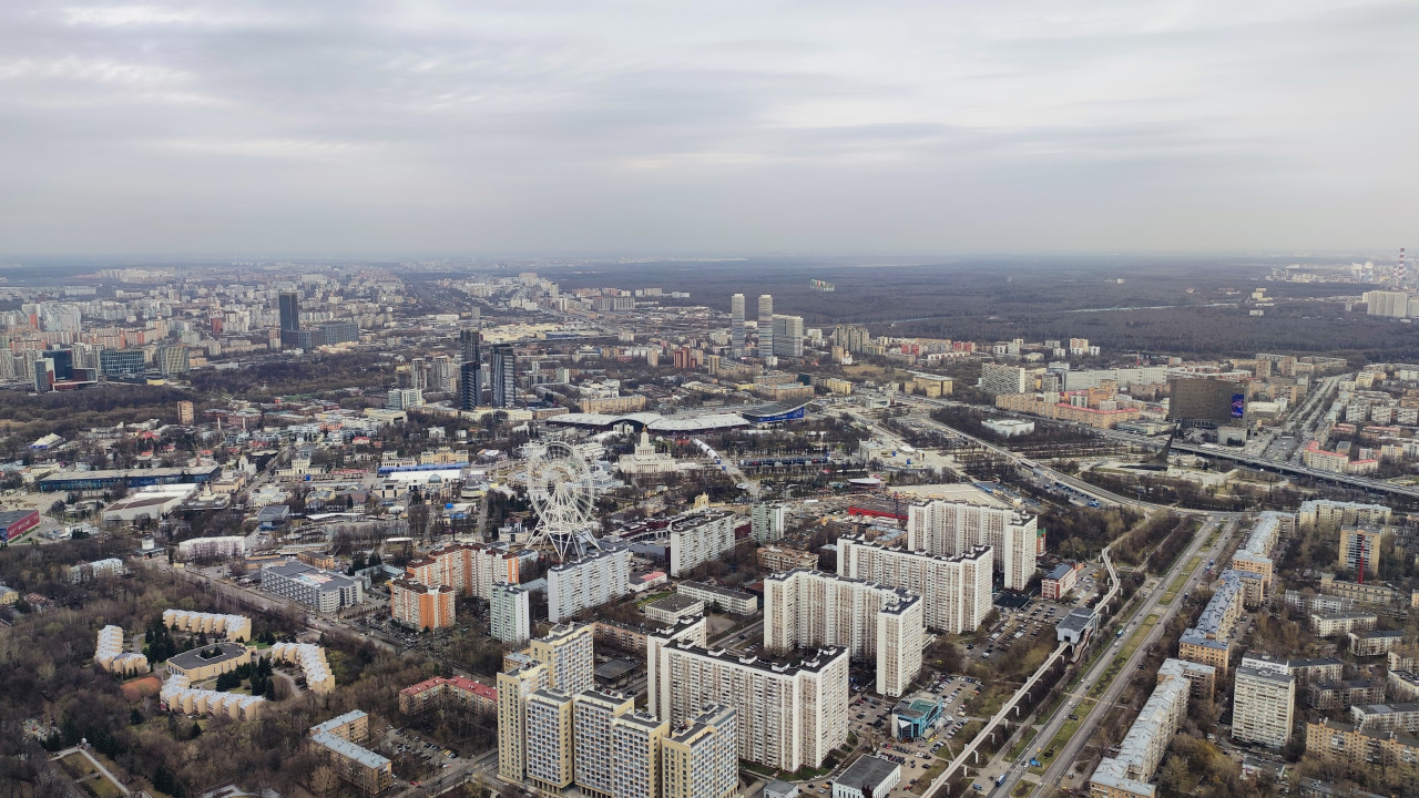 Вид на ВДНХ и жилые районы Москвы с высоты Останкинской башни