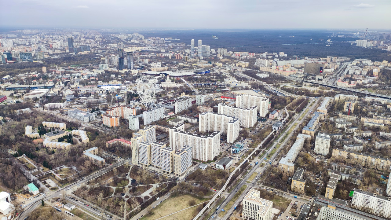 На фотографии запечатлена панорама московского района, включающая комплекс ВДНХ и современное колесо обозрения, различимое в центре кадра. Съёмка выполнена с Останкинской телебашни, что подтверждается высокой точкой обзора и широким углом покрытия городской застройки. В кадре присутствуют жилые кварталы, транспортные линии и обширная парковая зона. ВДНХ — исторический выставочный комплекс, созданный в 1939 году и являющийся культурным объектом федерального значения. Снимок подходит для материалов о туризме, истории городской среды и крупных общественных пространствах.