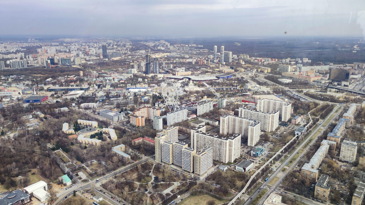 На фотографии изображён вид на Москву, снятый со смотровой площадки Останкинской телебашни, построенной в 1967 году по проекту архитектора Николая Никитина и являющейся объектом культурного наследия федерального значения. В кадре видны жилые районы, транспортные развязки, парковые массивы и колесо обозрения ВДНХ. Останкинская башня высотой 540 метров остаётся символом телевизионного вещания страны и популярной туристической площадкой. Снимок подходит для материалов о панорамах мегаполиса, развитии городской инфраструктуры и туристических маршрутах.