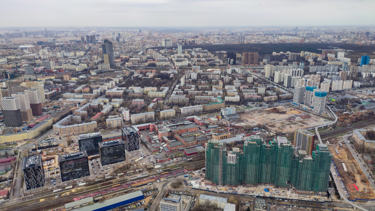 На снимке показан вид на районы Москвы, снятый с высотной смотровой площадки Останкинской телебашни — инженерного сооружения 1967 года, имеющего статус объекта культурного наследия федерального значения. В кадре различимы жилые кварталы, строящиеся комплексы, офисные здания и транспортные линии. Акцент смещён в сторону новых многоэтажных жилых комплексов и промышленных территорий, проходящих трансформацию. Фото подходит для тем о застройке, инфраструктуре мегаполиса и городском развитии.