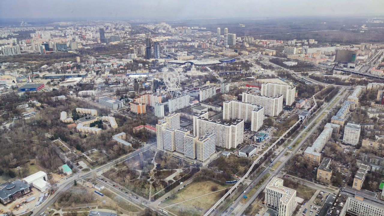 Фотография показывает обзорную панораму московского жилого района, снятую с большой высоты, вероятно со смотровой площадки Останкинской телебашни — инженерного сооружения, построенного в 1967 году и являющегося объектом культурного наследия. В кадре видны многоэтажные жилые кварталы, уличная сеть, дорожные развязки и большое колесо обозрения на территории ВДНХ. На горизонте заметна лесополоса и отдалённые районы города. Снимок может использоваться в публикациях об урбанистике, градостроительстве и туристической инфраструктуре.