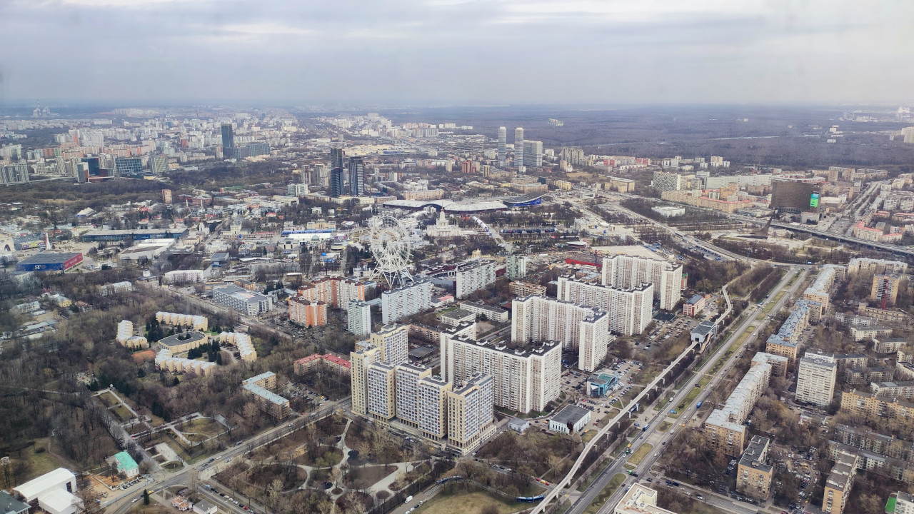 Снимок сделан со смотровой площадки Останкинской телебашни — знакового объекта инженерной архитектуры СССР, построенного в 1967 году и являющегося самой высокой телебашней в Европе. Внизу видны жилые массивы, транспортные магистрали, зелёные зоны и колесо обозрения на территории ВДНХ, что подчёркивает расположение панорамы в северо-восточной части Москвы. Лесополоса на горизонте отделяет городскую застройку от пригородных территорий. Кадр информативен для тем о городском планировании, истории телевещания и обзорных смотровых площадках мегаполиса.