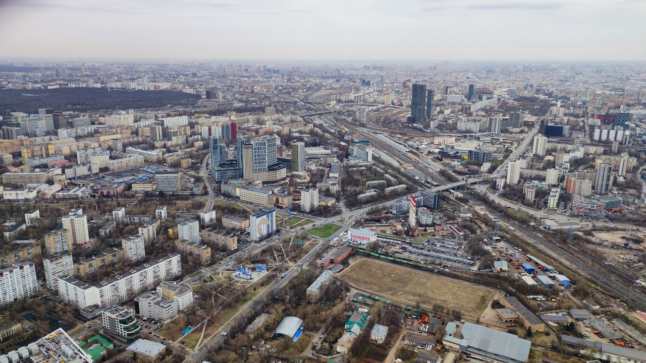 Снимок демонстрирует панорамный вид на городскую застройку Москвы, снятый со смотровой площадки Останкинской телебашни — инженерного сооружения, построенного в 1960–1967 годах и относящегося к объектам культурного наследия. В кадре видны жилые районы, транспортные магистрали и современные высотные здания, образующие плотную структуру мегаполиса. Дальний план включает лесные массивы и промышленную зону. Фотография может использоваться в материалах об урбанистике, территориальном развитии и обзорных площадках столицы.