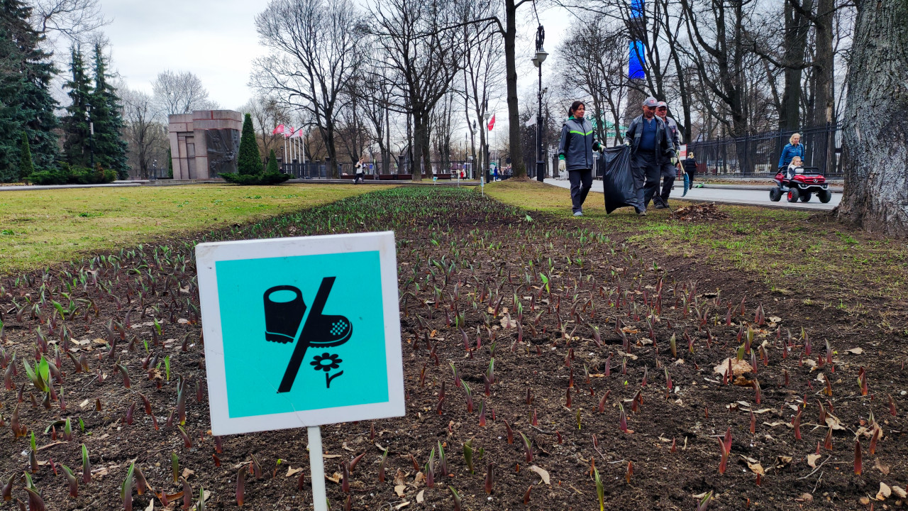 На изображении показан участок парка с молодой растительностью и табличкой, запрещающей ходить по клумбе и повреждать растения. На фоне видны деревья без листвы, прохожие и элементы ограждения, что указывает на ранний весенний период городского благоустройства. Дорожки и ухоженные газоны подчёркивают статус территории как общественной зоны отдыха. Снимок можно использовать в материалах о городском озеленении, работе коммунальных служб и правилах поведения в общественных пространствах.