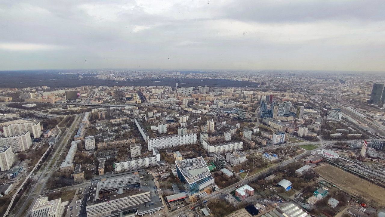 На снимке изображён панорамный вид Москвы, сделанный с обзорной площадки Останкинской телебашни. В кадре заметны жилые массивы северо-восточной части города, дороги, парки и отдельные современные высотные здания. Останкинская башня — знаковое инженерное сооружение, построенное в 1967 году и являющееся памятником техники и объектом культурного наследия. Такое изображение используется в урбанистических материалах, о городской застройке и туристической инфраструктуре.