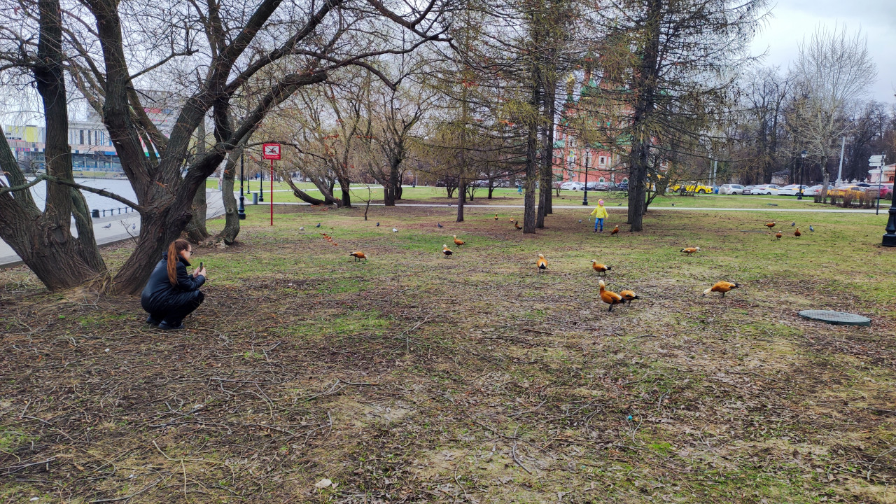 Кадр сделан в одном из московских парков, где на открытом участке газона пасутся многочисленные водоплавающие птицы, похожие на огарей (рыжие утки), свободно обитающие вблизи водоема. На заднем плане видна идущая по тропинке семья, деревья находятся без листвы, что указывает на раннюю весну. Женщина в кадре снимает птиц на мобильный телефон, рядом заметны городские постройки и припаркованные автомобили вдоль проезжей части. Снимок подходит для тем о природе в городе, экологической инфраструктуре и наблюдении за птицами.