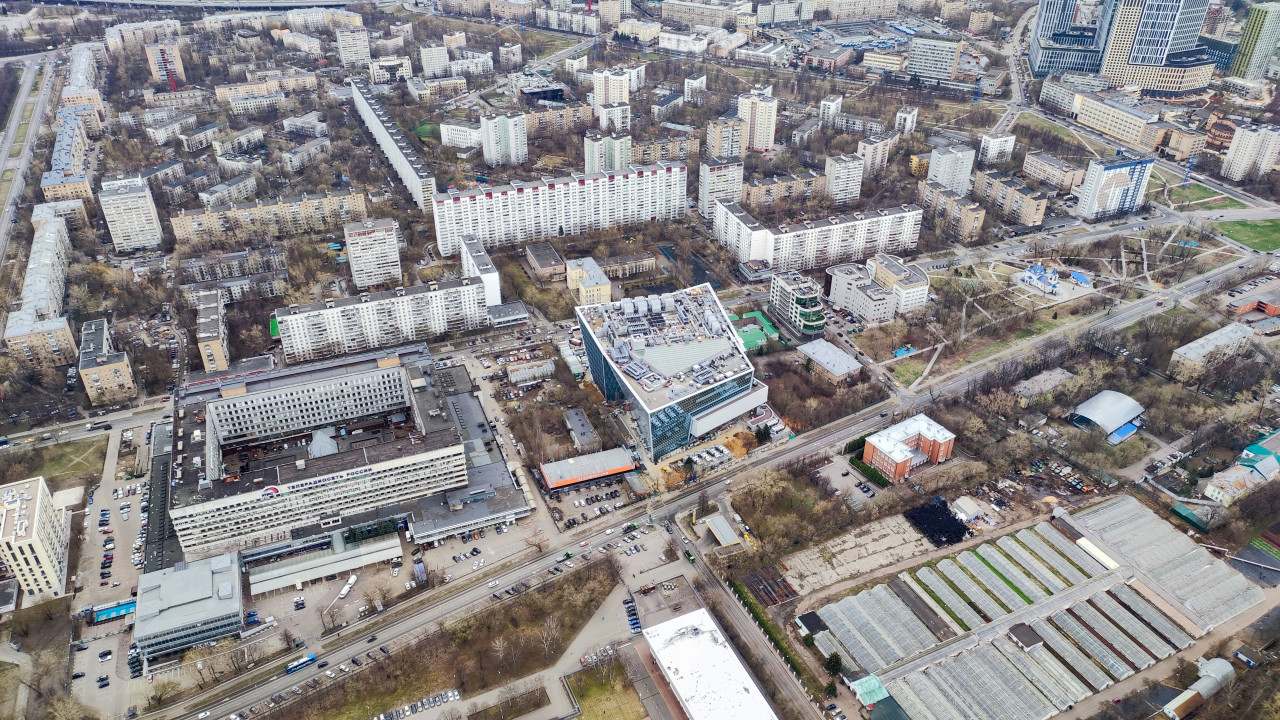 На фото показан жилой массив Москвы, снятый со смотровой площадки Останкинской телебашни. В центре кадра расположены многоэтажные жилые дома, административные постройки и современные корпуса со стеклянными фасадами. Территория окружена парковой зоной и внутренними дворами. Останкинская башня является символом инженерной архитектуры второй половины XX века и объектом культурного наследия. Снимок подходит для иллюстраций о планировке городской застройки и визуальной динамике мегаполиса.