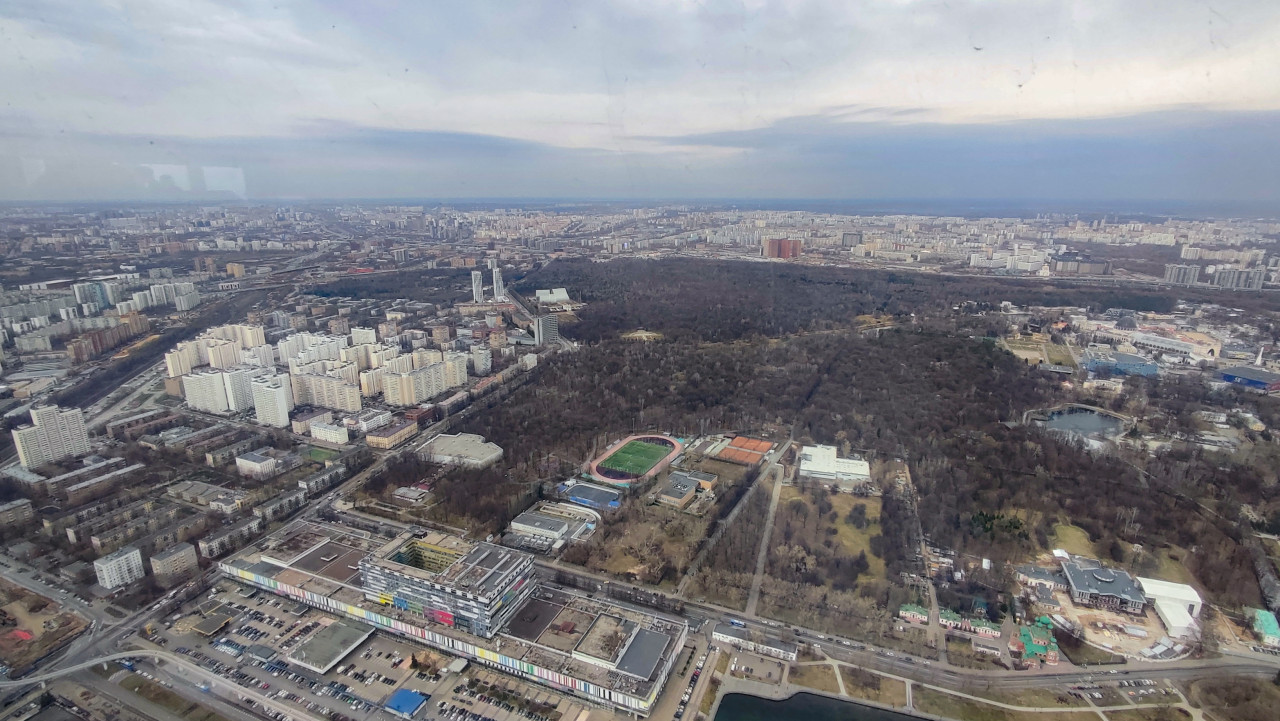 Снимок выполнен с обзорной площадки Останкинской телебашни, сооружённой в 1967 году и признанной объектом культурного наследия как центральный элемент национальной системы телерадиовещания. В кадре просматривается парковая зона, спортивные сооружения и обширный жилой массив северо-востока Москвы. Вид сверху позволяет оценить планировочную структуру района и масштабы городской застройки. Фотография подходит для материалов о градостроительной среде и наблюдательных площадках столицы.