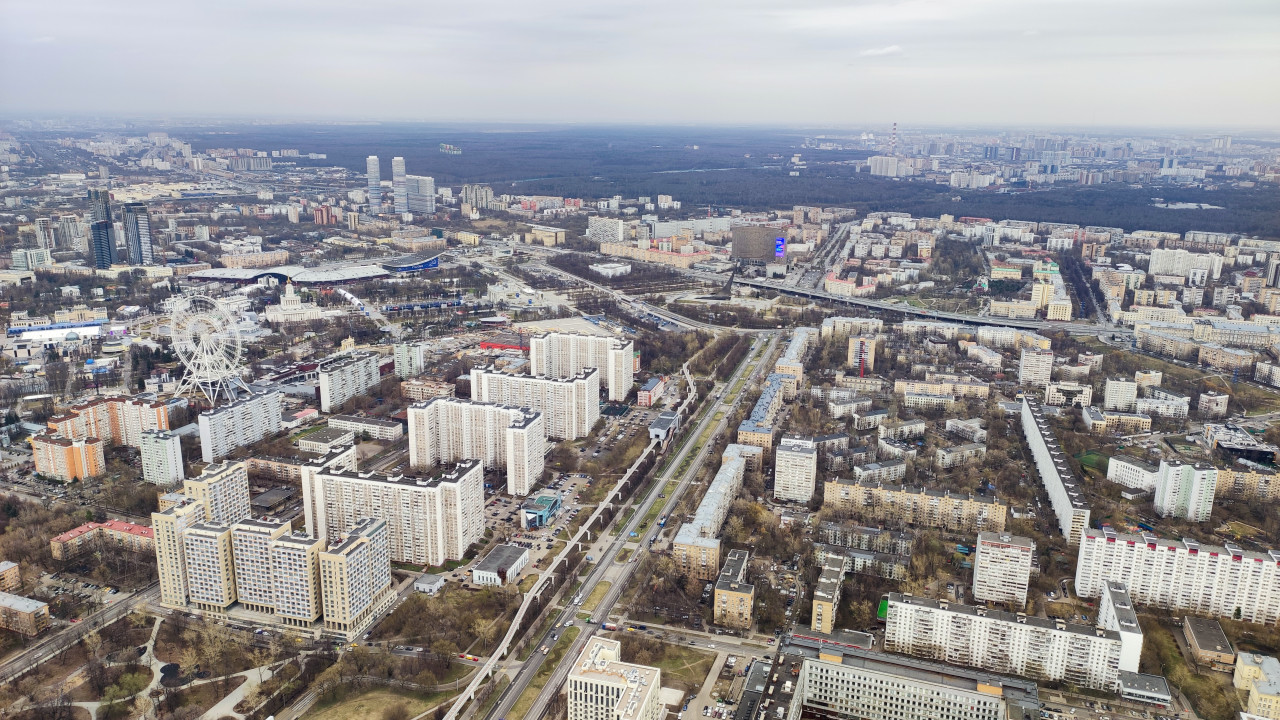 На изображении показан панорамный вид на северо-восточную часть Москвы, снятый с обзорной площадки Останкинской телебашни — инженерного сооружения 1967 года, признанного объектом культурного наследия и символом системы отечественного телерадиовещания. Виден жилой массив, дорожная сеть и крупные общественные здания, расположенные вдоль монорельсовой линии. Снимок подходит для материалов о городском развитии, транспортной инфраструктуре и визуальной идентификации районной планировки столицы.