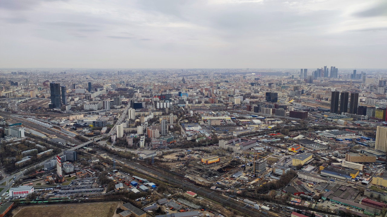 На фотографии запечатлена панорама столицы, снятая со смотровой площадки Останкинской телебашни, построенной в 1967 году по проекту инженера Николая Никитина. В центре перспективы расположен деловой кластер «Москва-Сити», формирующий доминанту горизонта. Ниже видны жилые массивы, промышленные зоны и транспортные артерии. Панорамный ракурс позволяет использовать снимок для аналитических материалов о городской структуре, визуальных ориентирах и современных форматах освоения пространства.