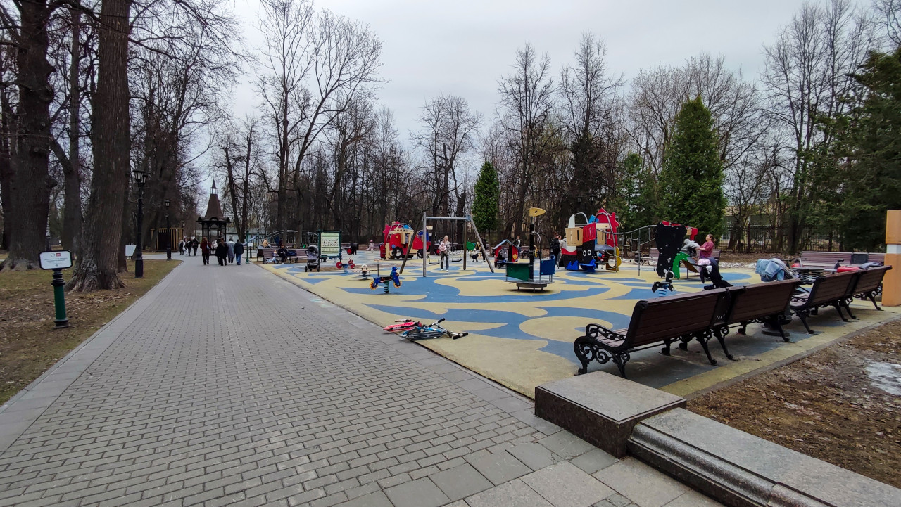 На фото показана детская игровая зона в московском парке, оборудованная качелями, горками и тематическими конструкциями. Справа установлены скамейки, слева проходит мощеная пешеходная аллея, по которой движутся посетители. Деревья без листвы указывают на ранневесенний период. Площадка расположена в пределах крупной зеленой зоны, характерной для центральных парков Москвы, где созданы условия для семейного отдыха и прогулок. Снимок подходит для публикаций о городской среде, досуге и детской инфраструктуре.