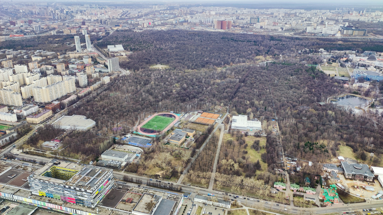На изображении запечатлён крупный зелёный массив Останкинского парка и прилегающих рекреационных территорий, снятый с высоты Останкинской телебашни — ключевого инженерного сооружения советской эпохи и символа отечественного телевещания. В нижней части кадра видны спортивные объекты и здания вспомогательной инфраструктуры, справа — элементы парковой застройки и фрагменты выставочного комплекса ВДНХ. Пространственный охват подчёркивает масштаб парковой зоны в границах плотной городской среды. Снимок можно использовать в материалах о ландшафтном планировании и городской экологии.