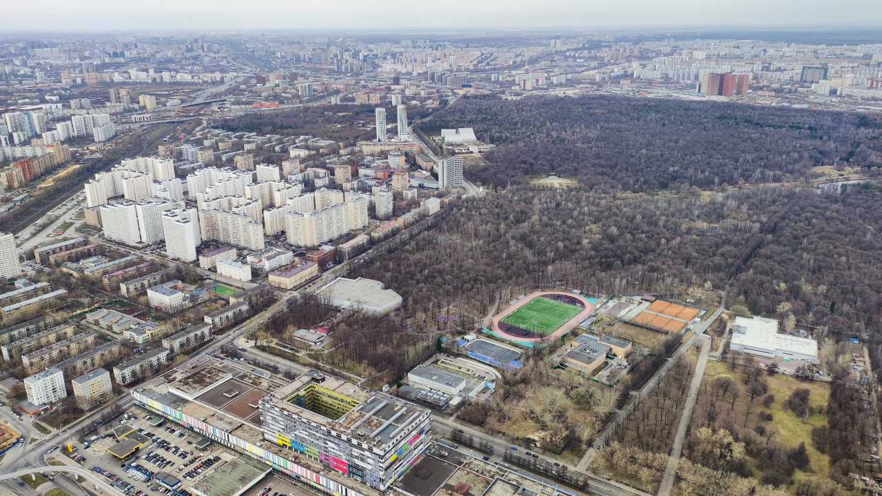 Фото сделано с высоты Останкинской телебашни, символа советской инженерной школы и главного телекоммуникационного объекта столицы. На переднем плане расположен стадион с беговыми дорожками и футбольным полем, вокруг — кварталы типовой жилой застройки. За ними виден крупный лесопарк, формирующий зелёный барьер между районами. Сочетание рекреации, спортивной инфраструктуры и многоэтажных домов отражает особенности районного планирования советского периода и постепенную модернизацию территории. Снимок подходит для материалов о городской экологии и социальной инфраструктуре.