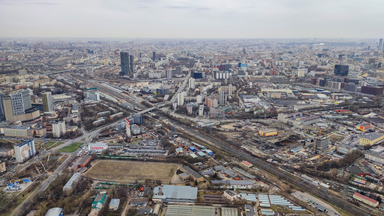 Снимок выполнен с Останкинской телебашни — одного из крупнейших символов телерадиовещания СССР и современного инженерного наследия. В нижней части кадра проходят железнодорожные пути и производственные объекты, за ними разворачиваются жилые массивы с разноэтажной застройкой. Вдали видны деловые комплексы и новые здания, образующие вертикальные акценты городской среды. Кадр позволяет рассмотреть функциональное разделение территорий и взаимодействие транспортной сети с жилой застройкой.