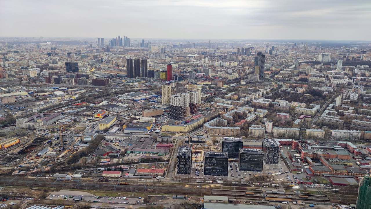 На фотографии представлен западный сектор Москвы, снятый с обзорной площадки Останкинской телебашни — инженерного сооружения 1967 года, служащего центральным телекоммуникационным узлом столицы. В центре кадра выделяются современные многофункциональные кварталы и высотные жилые комплексы, окруженные фрагментами бывших промышленных зон. Вдали заметен деловой кластер с высотной застройкой, а ниже — транспортные пути и железнодорожная инфраструктура. Кадр отражает смешанную градоструктуру и постепенную трансформацию городской среды.