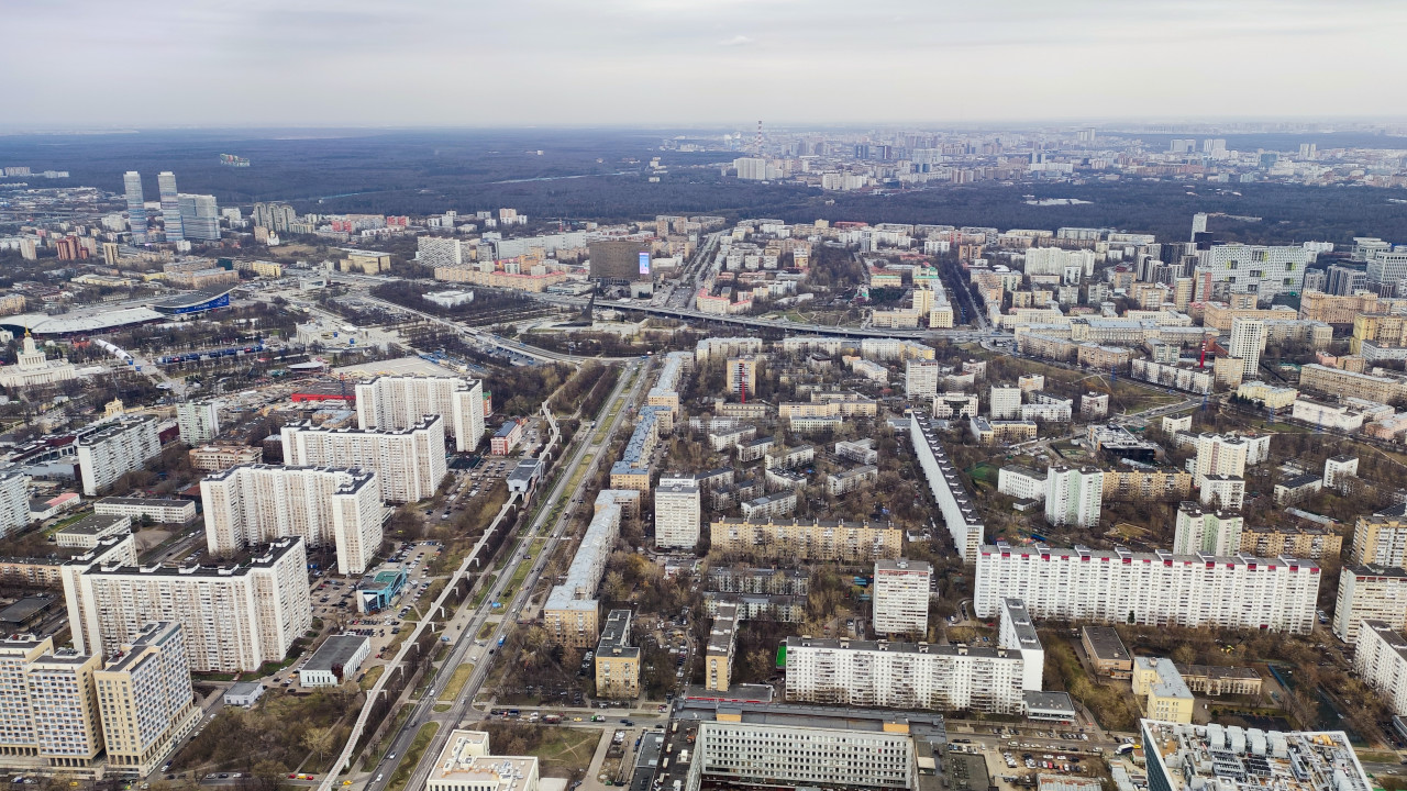 Фотография снята с высоты Останкинской телебашни — монументального инженерного объекта эпохи СССР, известного как символ телерадиовещания. На переднем плане видны протяженные жилые массивы, двориковая застройка и уличная сетка, далее — большие зеленые территории и локальные транспортные узлы. Снимок отражает сочетание природных пространств и урбанизированной среды и подходит для материалов о планировке жилых районов и экологическом каркасе города.