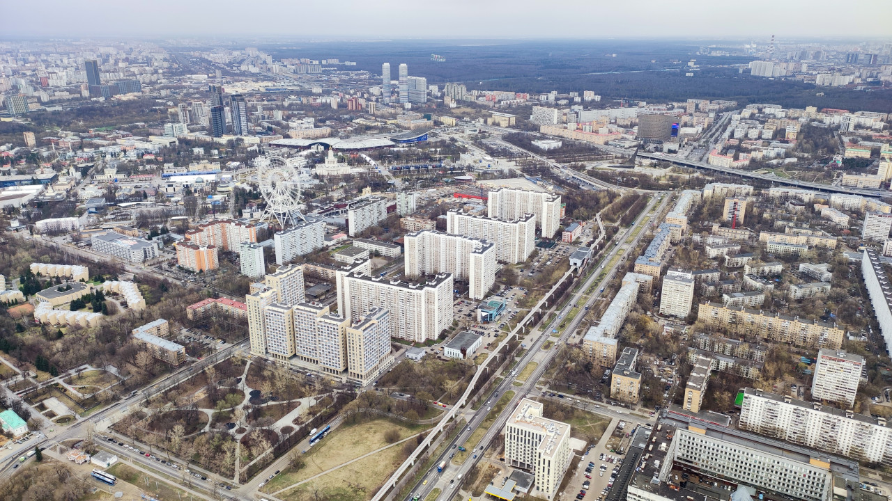 Снимок запечатлён с Останкинской телебашни — знакового инженерного сооружения советского периода и символа российского телерадиовещания. В центральной части кадра различимы павильоны ВДНХ и колесо обозрения как часть крупного выставочного и общественного пространства. Вокруг находятся массивы жилой застройки разных периодов, развитая улично-дорожная сеть и крупные зеленые территории. Фото применимо для материалов о градостроительной истории, туристической инфраструктуре и городской идентичности.