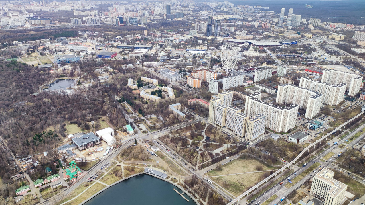 Снимок сделан с обзорной площадки Останкинской телебашни — инженерного объекта 1967 года, являющегося ключевым символом телерадиовещания столицы. В центре кадра располагается часть парковой территории ВДНХ и прилегающие жилые кварталы с многоэтажной застройкой. Видны дорожные аллеи, водоём и комплекс зданий исторического выставочного района. На дальнем плане — современные деловые кластеры и транспортные артерии. Кадр демонстрирует сочетание рекреационного пространства и плотной городской структуры и подходит для иллюстрации материалов о туризме, градостроительстве и общественной инфраструктуре.